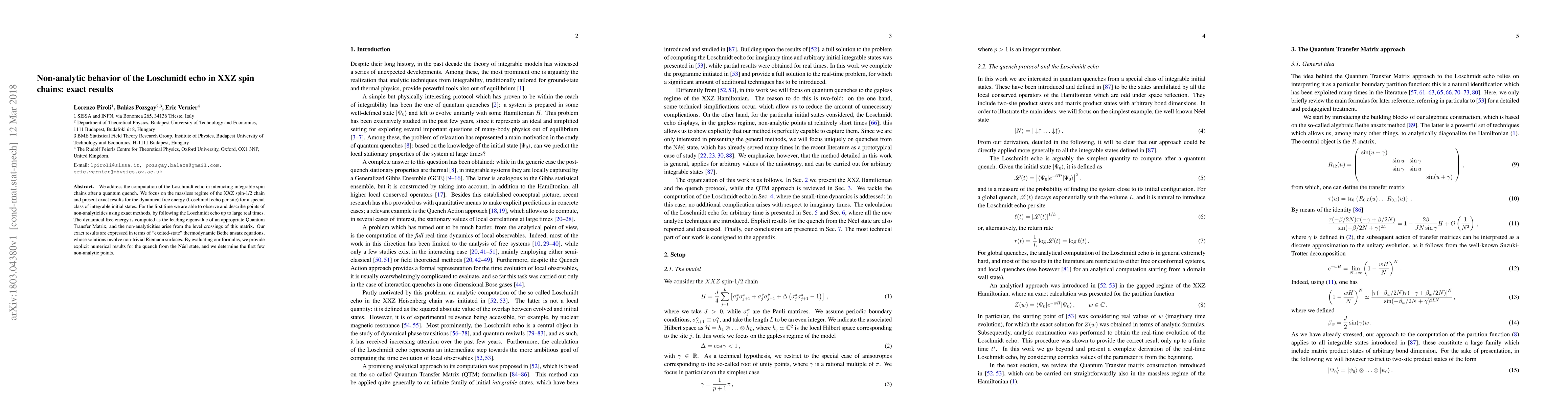 We address the computation of the Loschmidt echo in interacting integrable spin chains after a quantum quench. We focus on the massless regime of the XXZ spin-1/2 chain and present exact results for the dynamical free energy (Loschmidt echo per site) for a special class of integrable initial states. For the first time we are able to observe and describe points of non-analyticities using exact methods, by following the Loschmidt echo up to large real times. The dynamical free energy is computed as the leading eigenvalue of an appropriate Quantum Transfer Matrix, and the non-analyticities arise from the level crossings of this matrix. Our exact results are expressed in terms of "excited-state" thermodynamic Bethe ansatz equations, whose solutions involve non-trivial Riemann surfaces. By evaluating our formulas, we provide explicit numerical results for the quench from the N\'eel state, and we determine the first few non-analytic points.