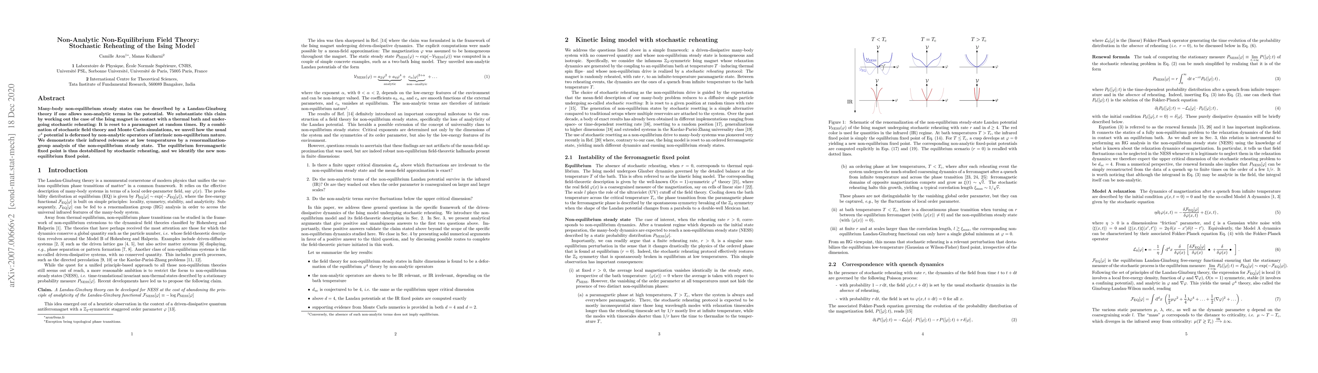 This paper explores how non-analytic terms in the potential of a Landau-Ginzburg theory can describe many-body non-equilibrium steady states, using the Ising model undergoing stochastic reheating. It combines stochastic field theory and Monte Carlo simulations to reveal the deformation of the $\varphi^4$ potential by non-equilibrium operators, identifying a new non-equilibrium fixed point.
