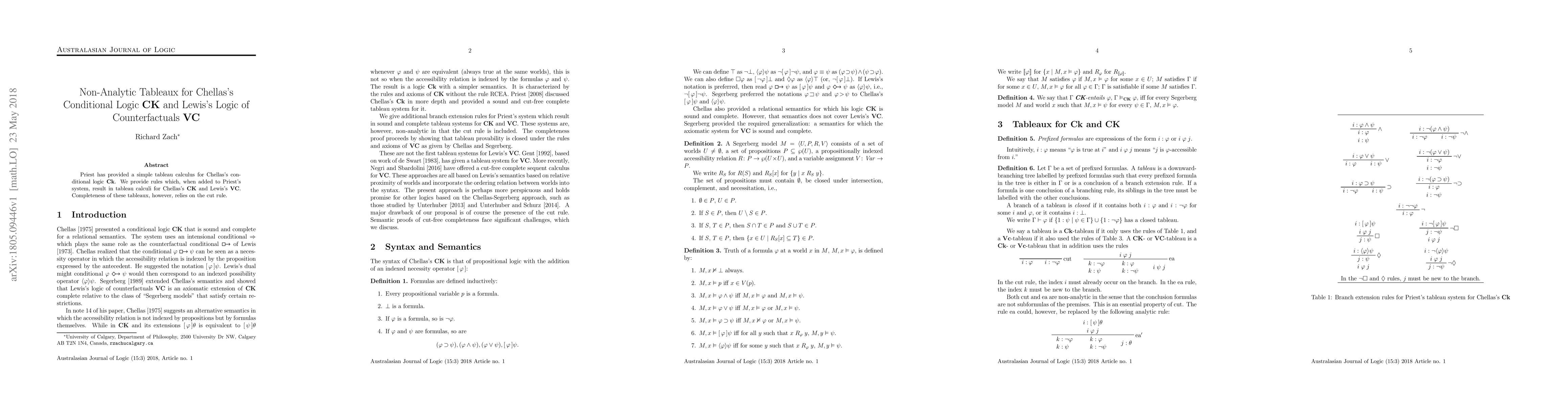 Priest has provided a simple tableau calculus for Chellas's conditional logic Ck. We provide rules which, when added to Priest's system, result in tableau calculi for Chellas's CK and Lewis's VC. Completeness of these tableaux, however, relies on the cut rule.