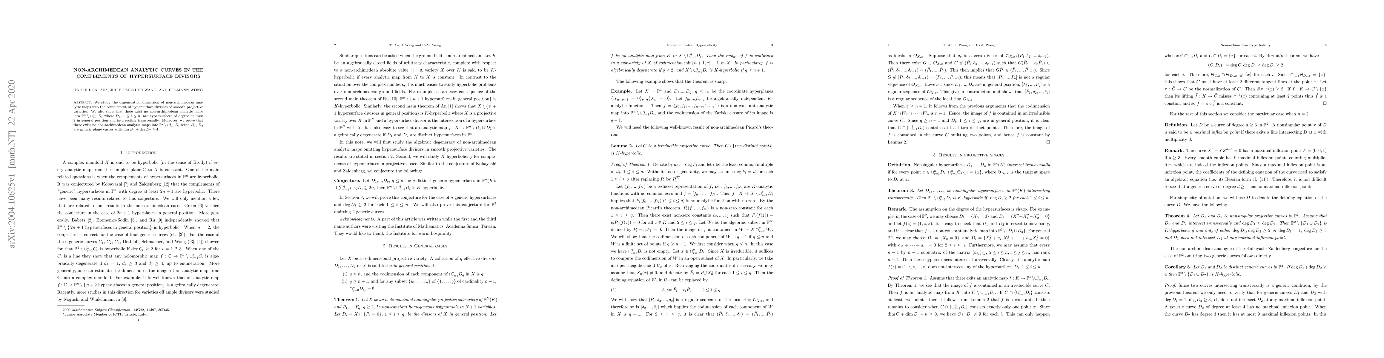 We study the degeneration dimension of non-archimedean analytic maps into the complement of hypersurface divisors of smooth projective varieties. We also show that there exist no non-archimedean analytic maps into $P^n\setminus\cup_{i= 1}^n D_i$ where $D_i, 1\le i\le n$, are hypersurfaces of degree at least 2 in general position and intersecting transversally. Moreover, we prove that there exist no non-archimedean analytic maps into $P^2\setminus\cup_{i=1}^2 D_i$ when $D_1, D_2$ are generic plane curves with deg$D_1+$deg$D_2\ge 4$.