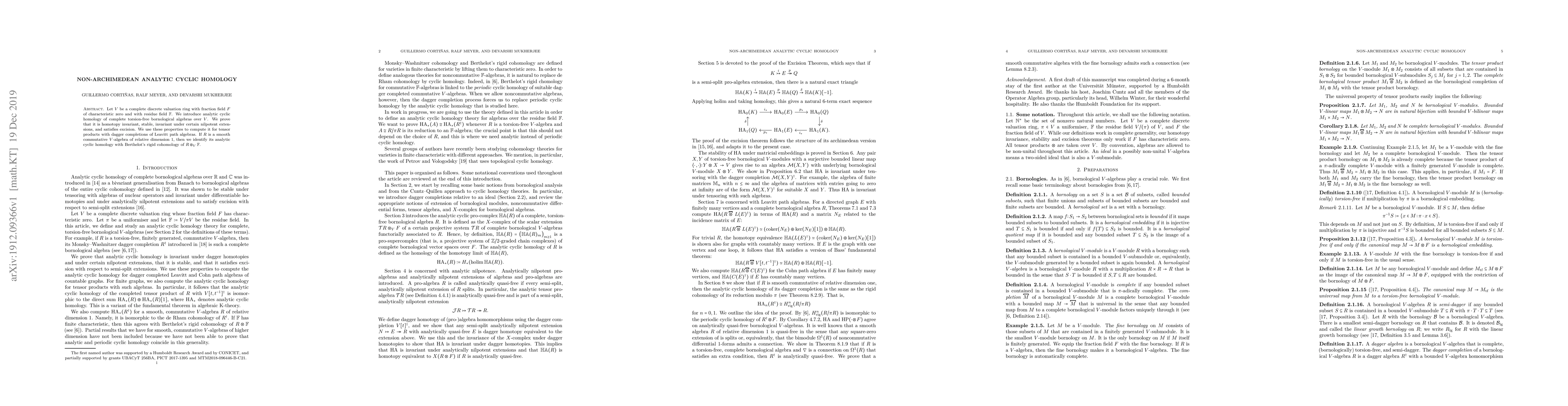 The paper introduces analytic cyclic homology for torsion-free bornological algebras over a complete valuation ring, proving its homotopy invariance and other properties. It computes this homology for tensor products with dagger completions of Leavitt path algebras and relates it to Berthelot's rigid cohomology for smooth commutative algebras.