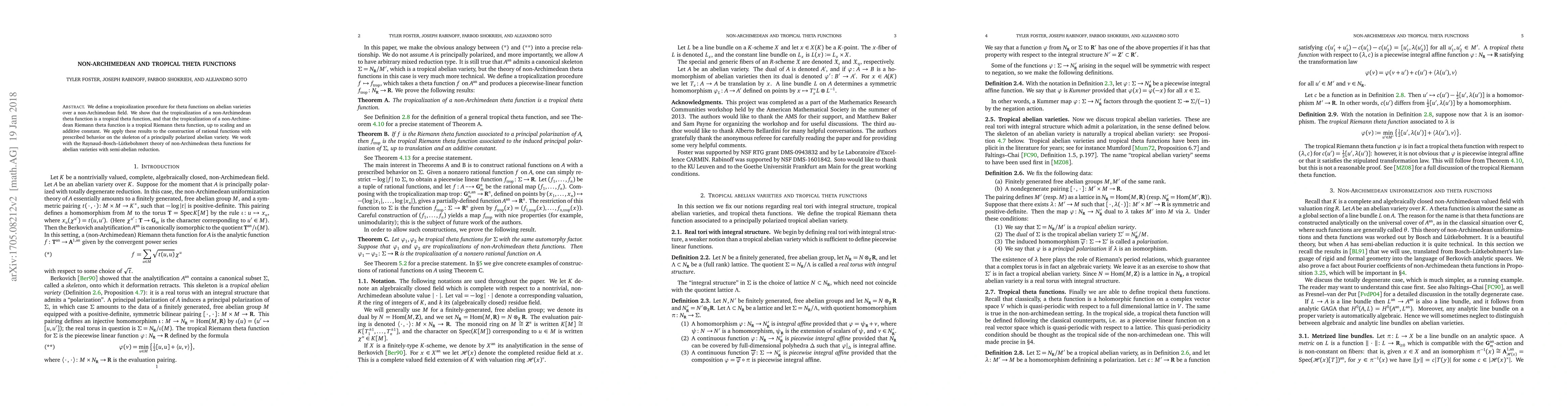 This paper introduces a tropicalization method for theta functions on abelian varieties over non-Archimedean fields, demonstrating that tropicalized forms correspond to tropical theta functions, with specific results for Riemann theta functions. The results are applied to construct rational functions with specified behaviors on the skeleton of principally polarized abelian varieties.
