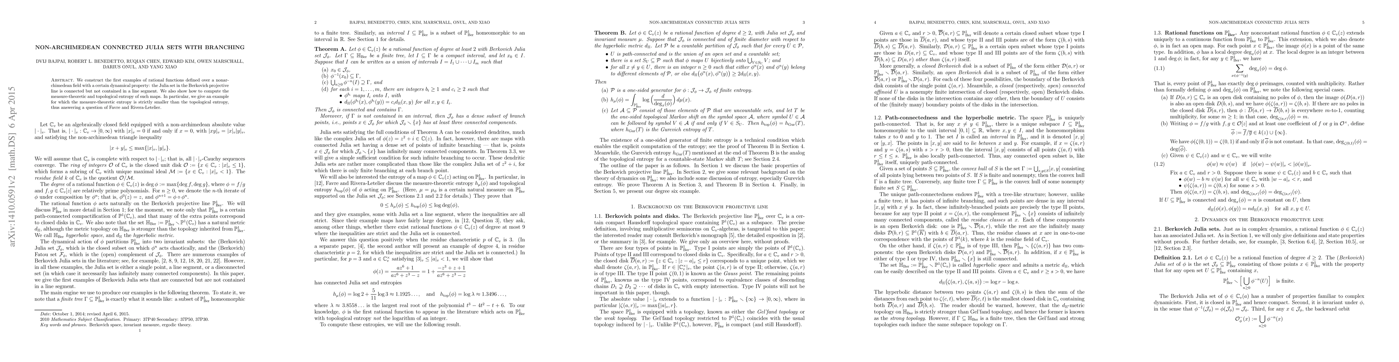 This paper constructs rational functions over non-archimedean fields with connected Julia sets that are not confined to line segments. It also computes the measure-theoretic and topological entropy, revealing that for some examples, the measure-theoretic entropy is strictly smaller than the topological entropy, addressing a question posed by Favre and Rivera-Letelier.