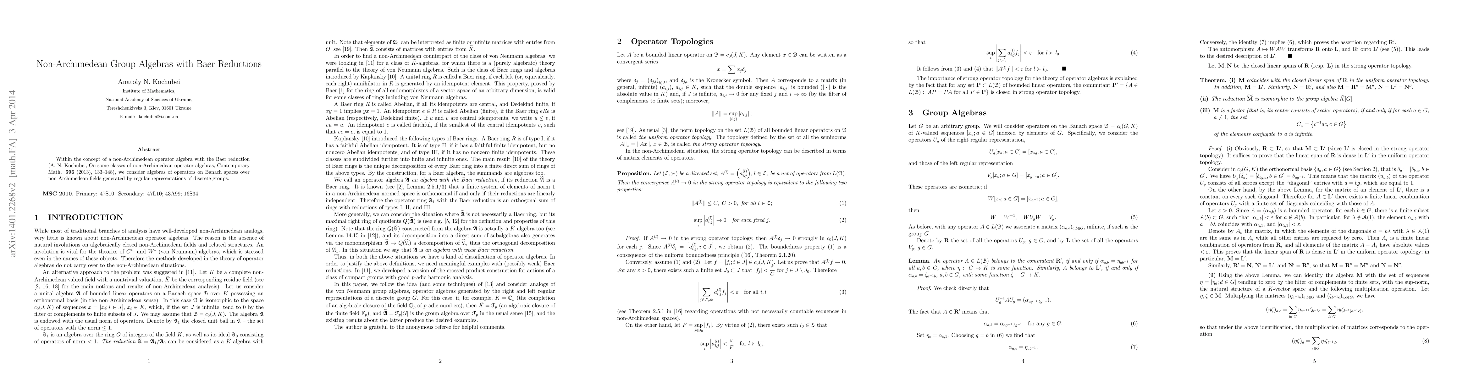 This paper investigates algebras of operators on Banach spaces over non-Archimedean fields, focusing on those generated by regular representations of discrete groups, employing the Baer reduction method.