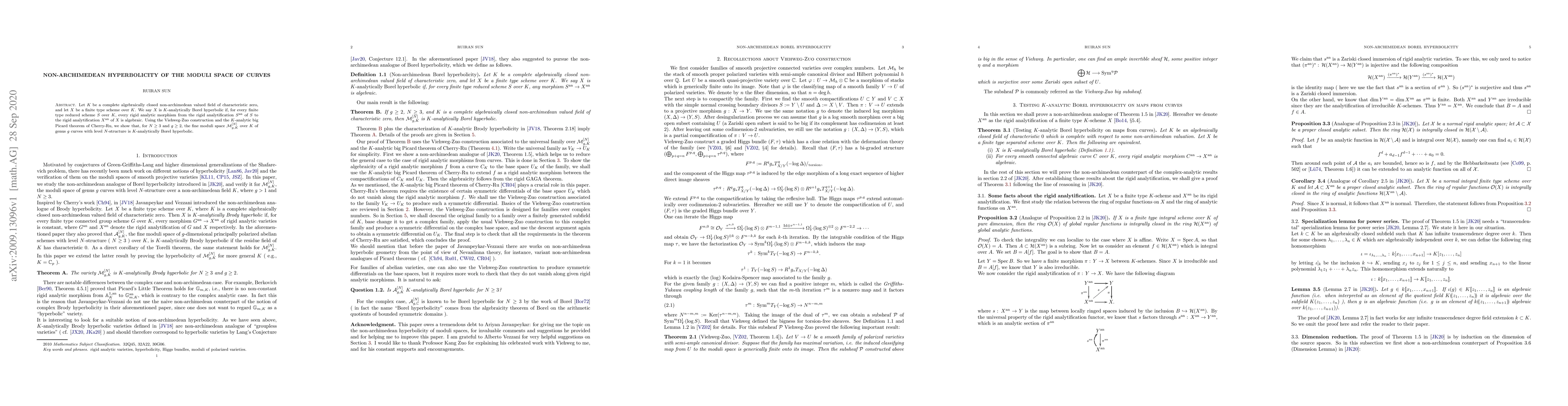 The moduli space of genus g curves with level N-structure is shown to be K-analytically Borel hyperbolic for N >= 3 and g >= 2, using the Viehweg-Zuo construction and Cherry-Ru's K-analytic big Picard theorem.