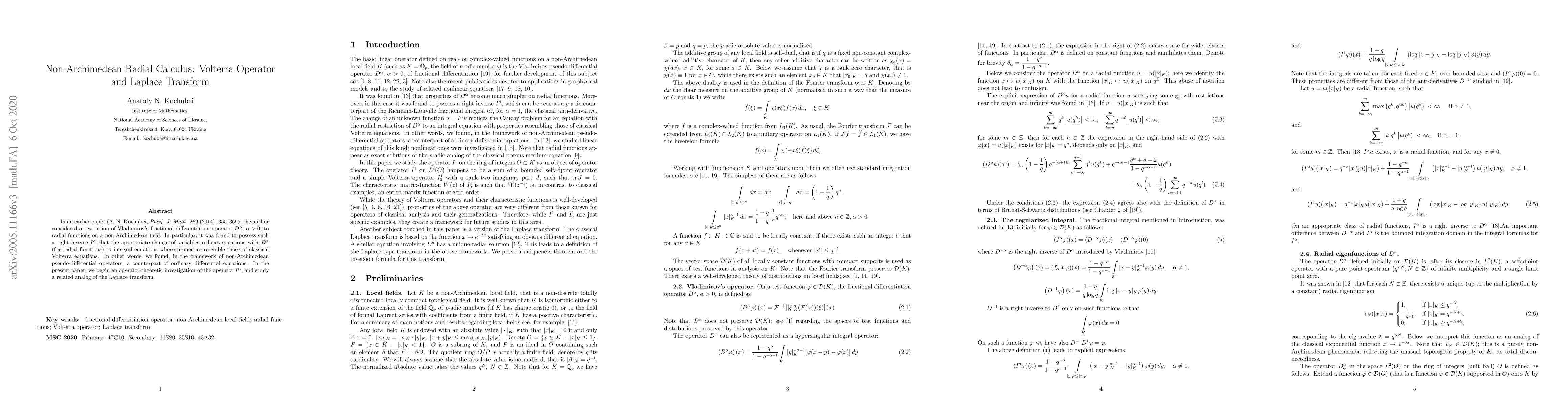 In an earlier paper (A. N. Kochubei, {\it Pacif. J. Math.} 269 (2014), 355--369), the author considered a restriction of Vladimirov's fractional differentiation operator $D^\alpha$, $\alpha >0$, to radial functions on a non-Archimedean field. In particular, it was found to possess such a right inverse $I^\alpha$ that the appropriate change of variables reduces equations with $D^\alpha$ (for radial functions) to integral equations whose properties resemble those of classical Volterra equations. In other words, we found, in the framework of non-Archimedean pseudo-differential operators, a counterpart of ordinary differential equations. In the present paper, we begin an operator-theoretic investigation of the operator $I^\alpha$, and study a related analog of the Laplace transform.