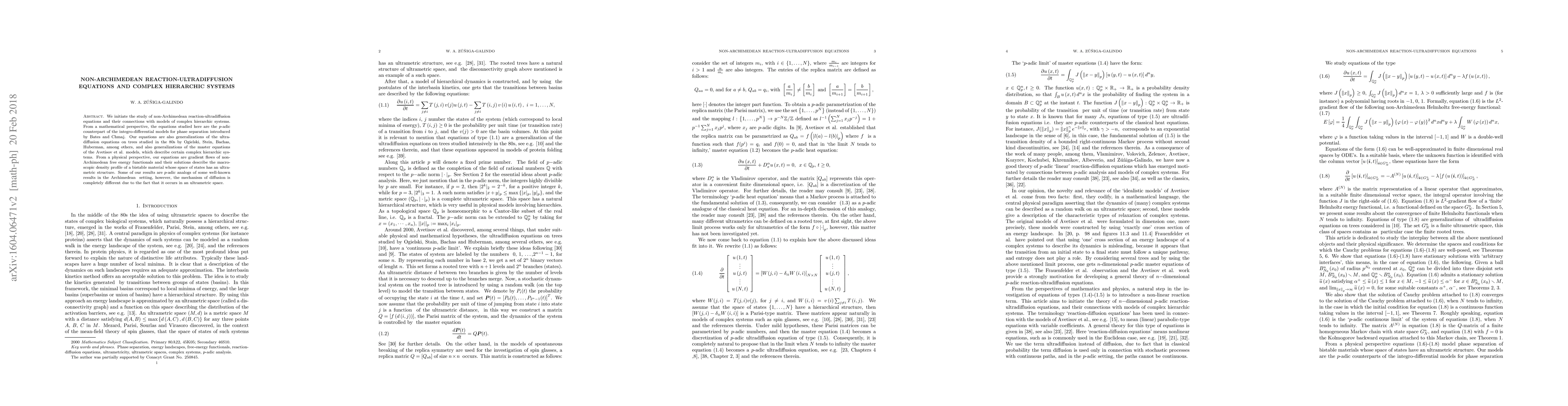 We initiate the study of non-Archimedean reaction-ultradiffusion equations and their connections with models of complex hierarchic systems. From a mathematical perspective, the equations studied here are the p-adic counterpart of the integro-differential models for phase separation introduced by Bates and Chmaj. Our equations are also generalizations of the ultradiffusion equations on trees studied in the 80's by Ogielski, Stein, Bachas, Huberman, among others, and also generalizations of the master equations of the Avetisov et al. models, which describe certain complex hierarchic systems. From a physical perspective, our equations are gradient flows of non-Archimedean free energy functionals and their solutions describe the macroscopic density profile of a bistable material whose space of states has an ultrametric structure. Some of our results are p-adic analogs of some well-known results in the Archimedean settting, however, the mechanism of diffusion is completely different due to the fact that it occurs in an ultrametric space.