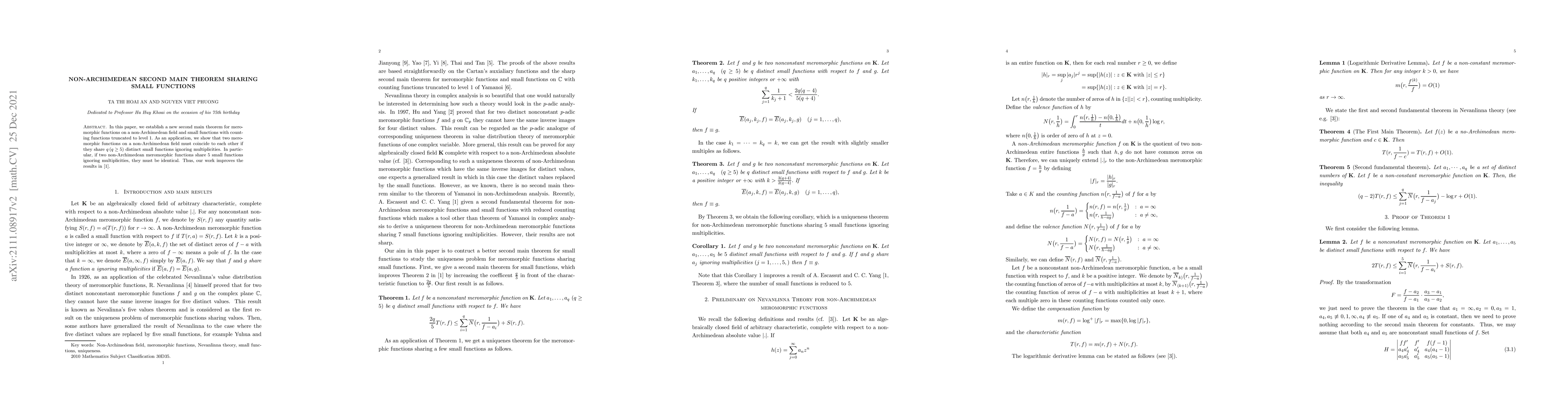 This paper presents a novel second main theorem for meromorphic functions on non-Archimedean fields, focusing on functions sharing small functions. It demonstrates that two such functions must coincide if they share $q \geq 5$ distinct small functions, improving upon previous results.