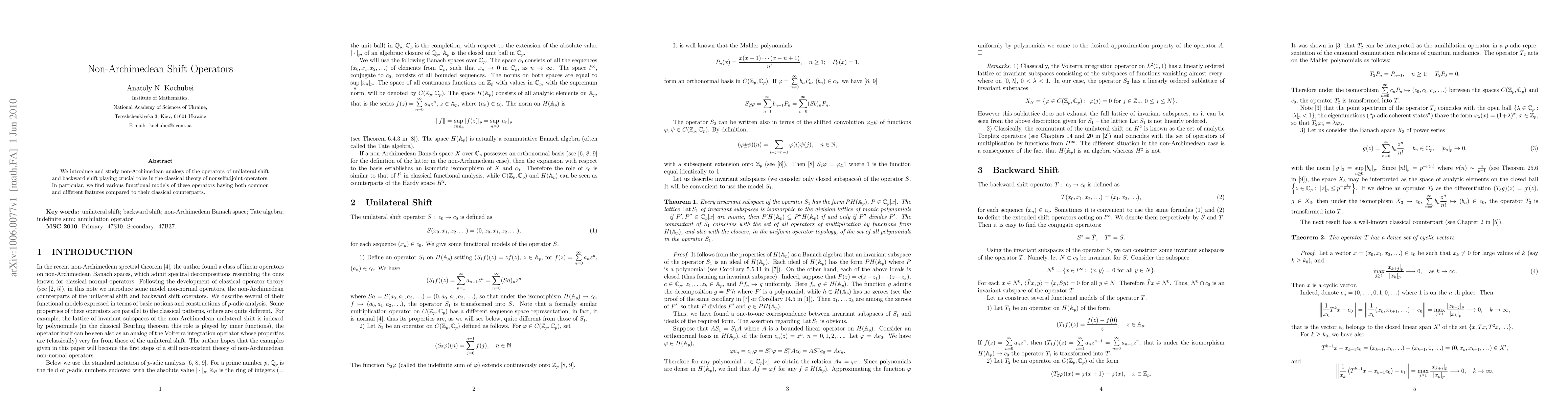 Summary: This paper explores non-Archimedean analogs of unilateral and backward shift operators, comparing their functional models with classical versions and highlighting unique characteristics.