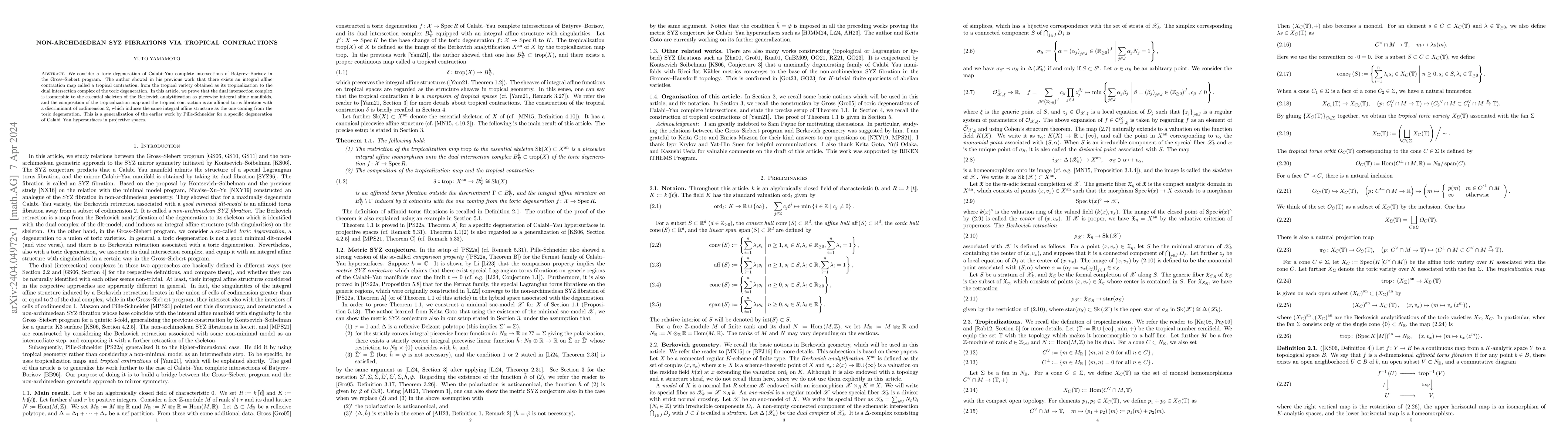 This paper generalizes the SYZ fibration concept to non-archimedean settings, demonstrating that tropical contractions from a toric degeneration of Calabi-Yau complete intersections result in an affinoid torus fibration. The dual intersection complex is shown to be isomorphic to the essential skeleton of the Berkovich analytification, maintaining the same integral affine structure as the original toric degeneration.