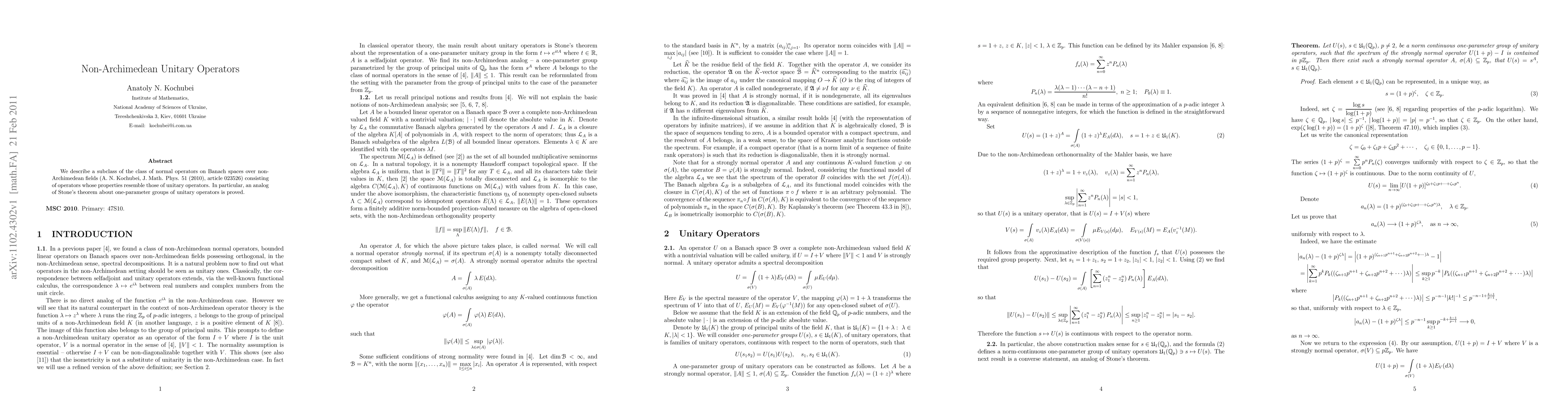 We describe a subclass of the class of normal operators on Banach spaces over non-Archimedean fields (A. N. Kochubei, J. Math. Phys. 51 (2010), article 023526) consisting of operators whose properties resemble those of unitary operators. In particular, an analog of Stone's theorem about one-parameter groups of unitary operators is proved.