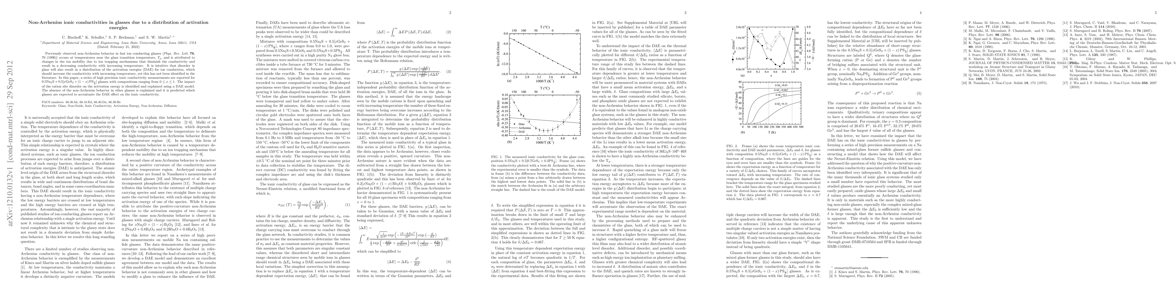 This paper investigates non-Arrhenius ionic conductivities in glasses near the glass transition temperature, attributing the behavior to ion trapping mechanisms. It proposes that cation site disorder leads to a distribution of activation energies, which increases conductivity with temperature, and uses a DAE model to explain the observed effects in specific glass compositions.