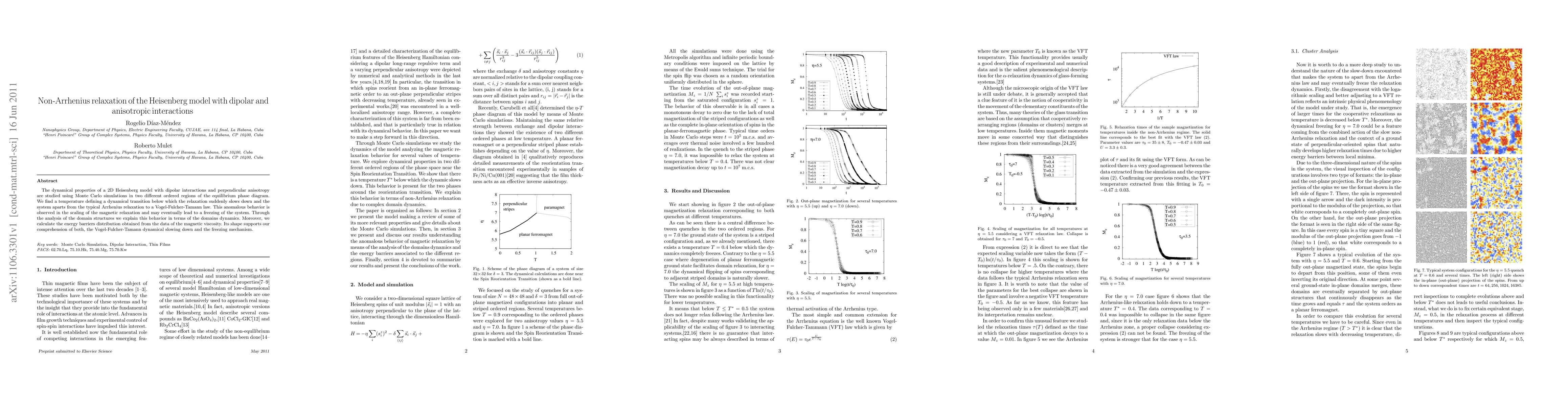 The dynamical properties of a 2D Heisenberg model with dipolar interactions and perpendicular anisotropy are studied using Monte Carlo simulations in two different ordered regions of the equilibrium phase diagram. We find a temperature defining a dynamical transition below which the relaxation suddenly slows down and the system aparts from the typical Arrhenius relaxation to a Vogel-Fulcher-Tamann law. This anomalous behavior is observed in the scaling of the magnetic relaxation and may eventually lead to a freezing of the system. Through the analysis of the domain structures we explain this behavior in terms of the domains dynamics. Moreover, we calculate the energy barriers distribution obtained from the data of the magnetic viscosity. Its shape supports our comprehension of both, the Vogel-Fulcher-Tamann dynamical slowing down and the freezing mechanism.