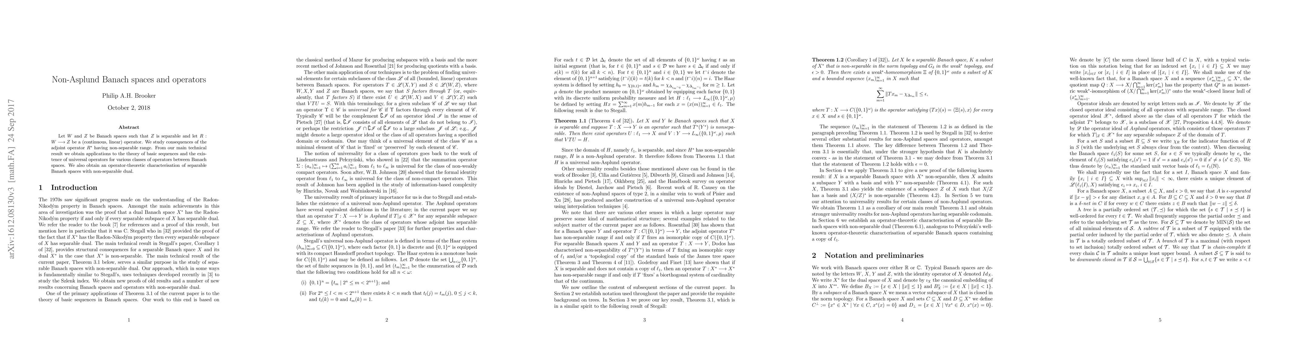 The paper introduces a detailed analysis of operators with non-separable ranges, leading to a deeper understanding of non-Asplund Banach spaces and their operators, including the construction of universal operators and characterization of separable duals.