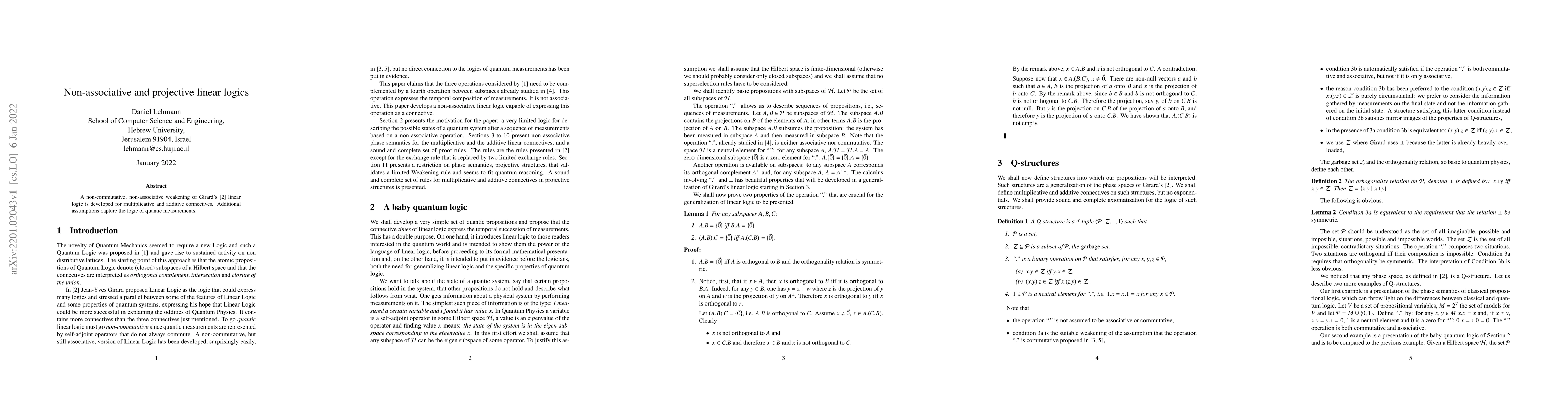 A non-commutative, non-associative weakening of Girard's linear logic is developed for multiplicative and additive connectives. Additional assumptions capture the logic of quantic measurements.