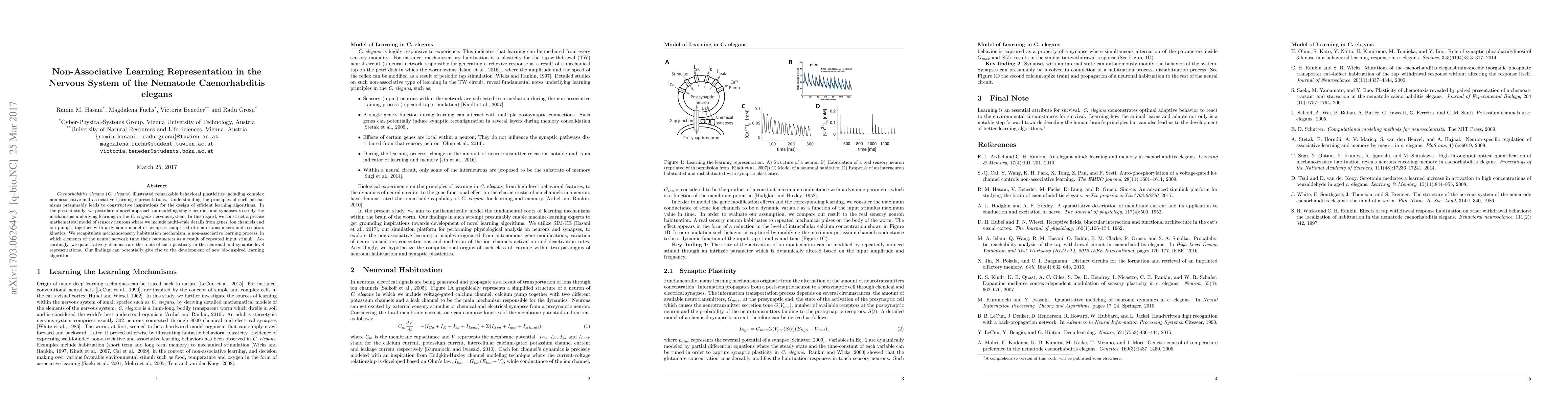 This study models the mechanisms of non-associative learning in C. elegans using detailed mathematical representations of neurons and synapses, demonstrating mechanosensory habituation and suggesting potential for bio-inspired learning algorithms.