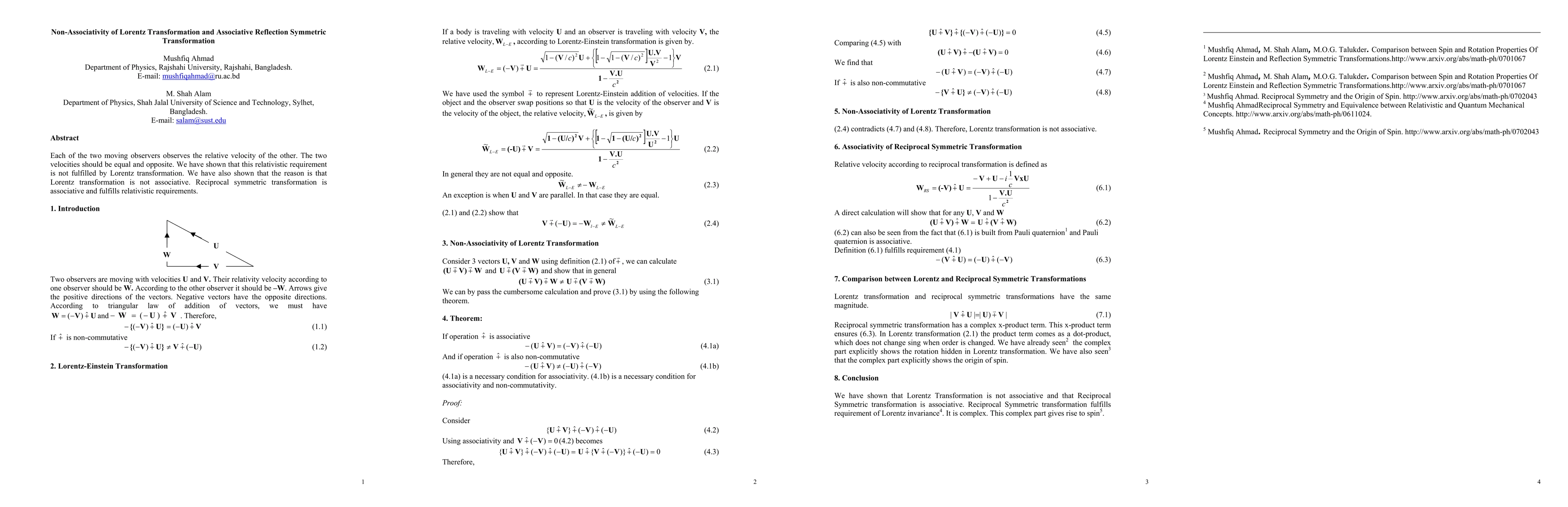 Summary: The paper demonstrates that Lorentz transformations fail to satisfy the relativistic requirement of equal and opposite relative velocities due to their non-associative nature. It proposes an alternative reciprocal symmetric transformation that is associative and meets these requirements.