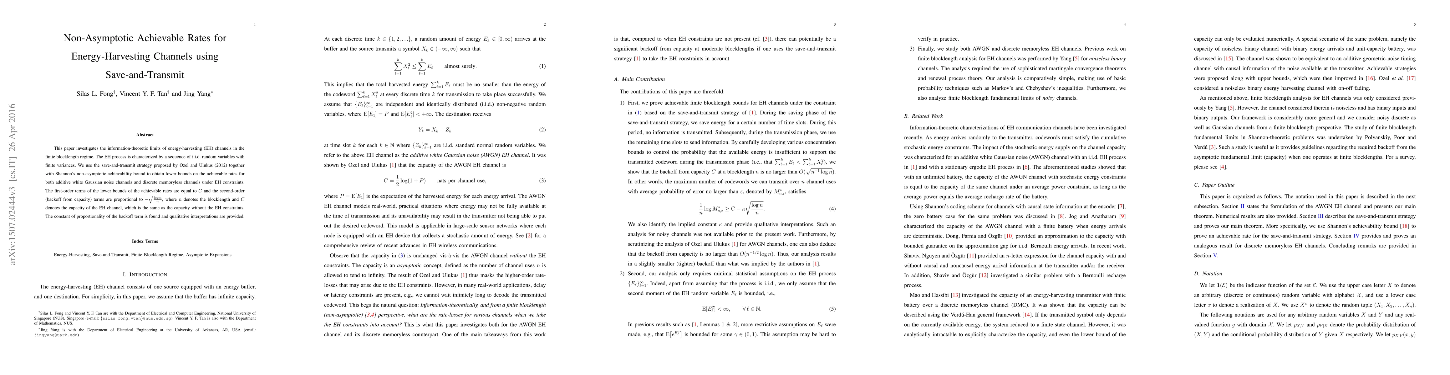 This paper investigates the information-theoretic limits of energy-harvesting (EH) channels in the finite blocklength regime. The EH process is characterized by a sequence of i.i.d. random variables with finite variances. We use the save-and-transmit strategy proposed by Ozel and Ulukus (2012) together with Shannon's non-asymptotic achievability bound to obtain lower bounds on the achievable rates for both additive white Gaussian noise channels and discrete memoryless channels under EH constraints. The first-order terms of the lower bounds of the achievable rates are equal to $C$ and the second-order (backoff from capacity) terms are proportional to $-\sqrt{ \frac{\log n}{n}}$, where $n$ denotes the blocklength and $C$ denotes the capacity of the EH channel, which is the same as the capacity without the EH constraints. The constant of proportionality of the backoff term is found and qualitative interpretations are provided.