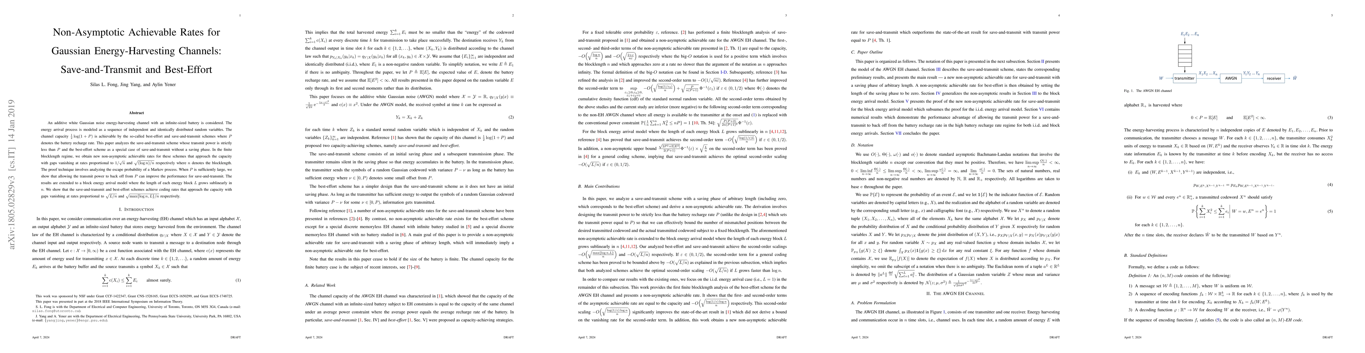 This paper investigates non-asymptotic achievable rates for Gaussian energy-harvesting channels under best-effort and save-and-transmit schemes. It demonstrates that these schemes achieve capacity with finite blocklengths, with performance gaps diminishing at rates proportional to $1/\sqrt{n}$ and $\sqrt{(\log n)/n}$ respectively.