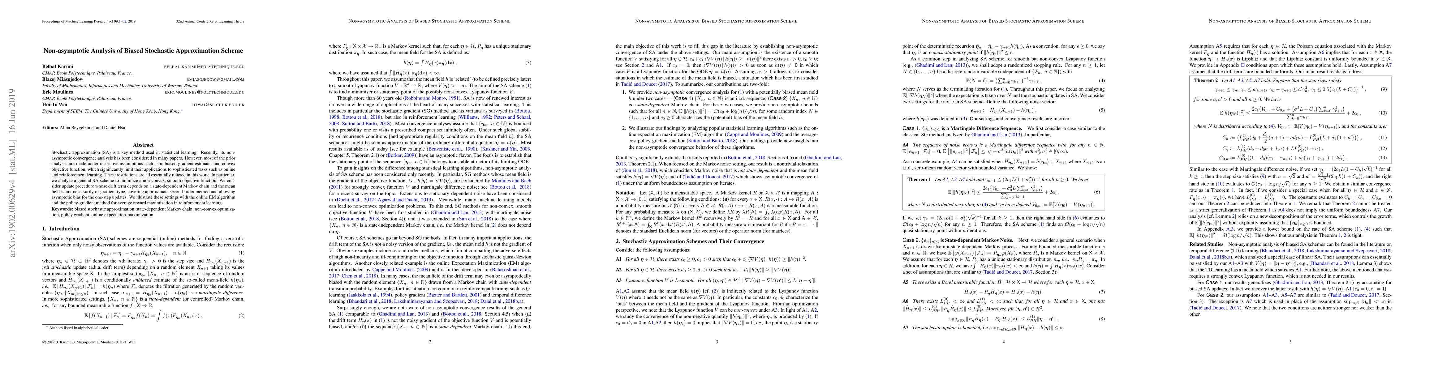 This paper provides a non-asymptotic convergence analysis for a general biased stochastic approximation scheme to minimize non-convex, smooth objective functions. It relaxes previous assumptions of unbiased gradient estimates and convexity, allowing for broader applications in online and reinforcement learning.