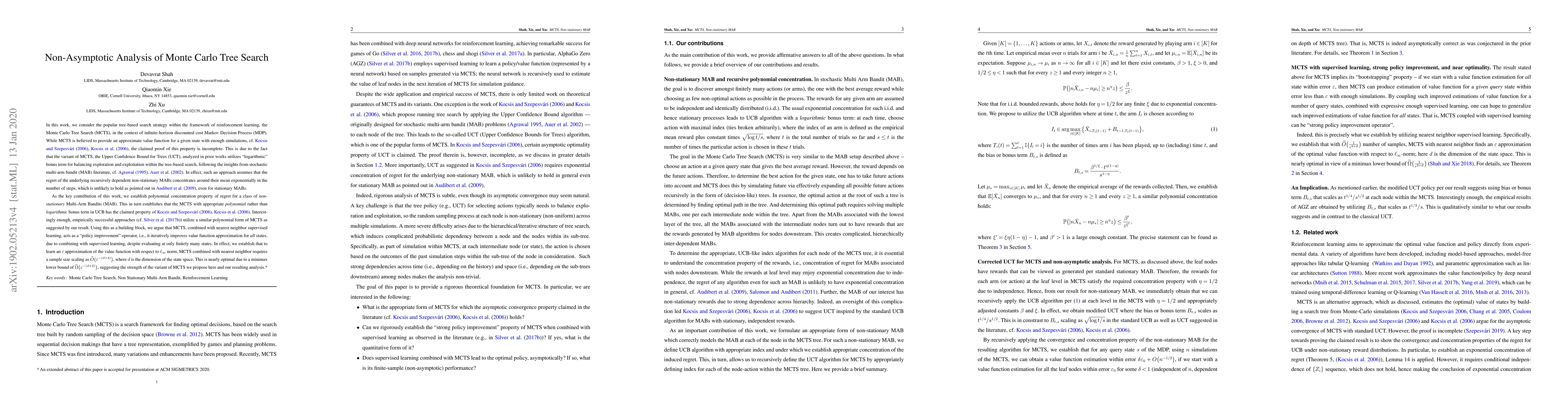 In this work, we consider the popular tree-based search strategy within the framework of reinforcement learning, the Monte Carlo Tree Search (MCTS), in the context of infinite-horizon discounted cost Markov Decision Process (MDP). While MCTS is believed to provide an approximate value function for a given state with enough simulations, the claimed proof in the seminal works is incomplete. This is due to the fact that the variant, the Upper Confidence Bound for Trees (UCT), analyzed in prior works utilizes "logarithmic" bonus term for balancing exploration and exploitation within the tree-based search, following the insights from stochastic multi-arm bandit (MAB) literature. In effect, such an approach assumes that the regret of the underlying recursively dependent non-stationary MABs concentrates around their mean exponentially in the number of steps, which is unlikely to hold as pointed out in literature, even for stationary MABs. As the key contribution of this work, we establish polynomial concentration property of regret for a class of non-stationary MAB. This in turn establishes that the MCTS with appropriate polynomial rather than logarithmic bonus term in UCB has the claimed property. Using this as a building block, we argue that MCTS, combined with nearest neighbor supervised learning, acts as a "policy improvement" operator: it iteratively improves value function approximation for all states, due to combining with supervised learning, despite evaluating at only finitely many states. In effect, we establish that to learn an $\varepsilon$ approximation of the value function with respect to $\ell_\infty$ norm, MCTS combined with nearest neighbor requires a sample size scaling as $\widetilde{O}\big(\varepsilon^{-(d+4)}\big)$, where $d$ is the dimension of the state space. This is nearly optimal due to a minimax lower bound of $\widetilde{\Omega}\big(\varepsilon^{-(d+2)}\big)$.