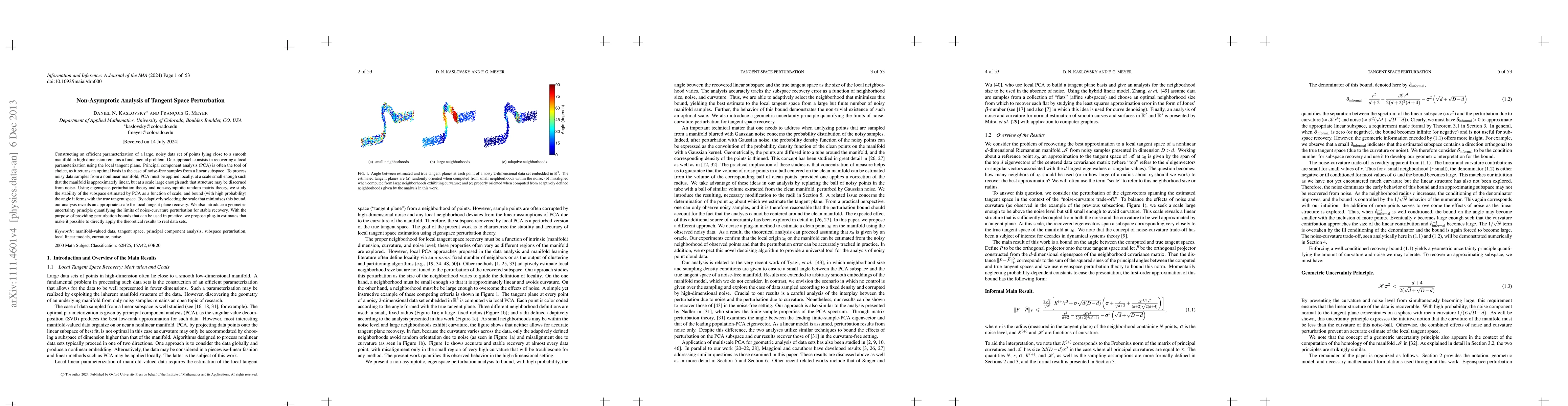 Constructing an efficient parameterization of a large, noisy data set of points lying close to a smooth manifold in high dimension remains a fundamental problem. One approach consists in recovering a local parameterization using the local tangent plane. Principal component analysis (PCA) is often the tool of choice, as it returns an optimal basis in the case of noise-free samples from a linear subspace. To process noisy data samples from a nonlinear manifold, PCA must be applied locally, at a scale small enough such that the manifold is approximately linear, but at a scale large enough such that structure may be discerned from noise. Using eigenspace perturbation theory and non-asymptotic random matrix theory, we study the stability of the subspace estimated by PCA as a function of scale, and bound (with high probability) the angle it forms with the true tangent space. By adaptively selecting the scale that minimizes this bound, our analysis reveals an appropriate scale for local tangent plane recovery. We also introduce a geometric uncertainty principle quantifying the limits of noise-curvature perturbation for stable recovery. With the purpose of providing perturbation bounds that can be used in practice, we propose plug-in estimates that make it possible to directly apply the theoretical results to real data sets.