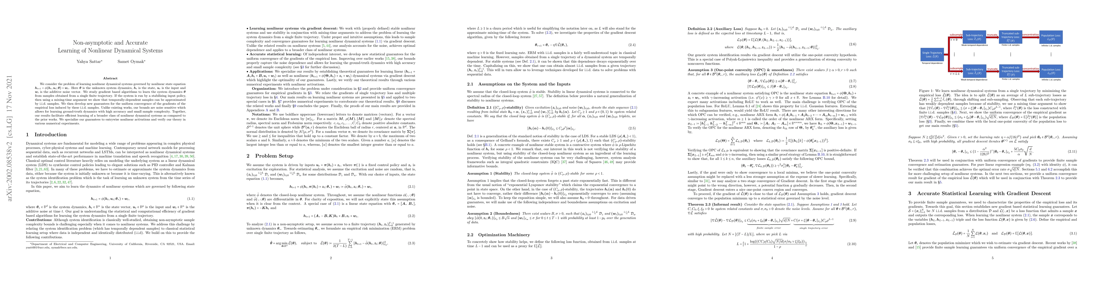 We consider the problem of learning stabilizable systems governed by nonlinear state equation $h_{t+1}=\phi(h_t,u_t;\theta)+w_t$. Here $\theta$ is the unknown system dynamics, $h_t $ is the state, $u_t$ is the input and $w_t$ is the additive noise vector. We study gradient based algorithms to learn the system dynamics $\theta$ from samples obtained from a single finite trajectory. If the system is run by a stabilizing input policy, we show that temporally-dependent samples can be approximated by i.i.d. samples via a truncation argument by using mixing-time arguments. We then develop new guarantees for the uniform convergence of the gradients of empirical loss. Unlike existing work, our bounds are noise sensitive which allows for learning ground-truth dynamics with high accuracy and small sample complexity. Together, our results facilitate efficient learning of the general nonlinear system under stabilizing policy. We specialize our guarantees to entry-wise nonlinear activations and verify our theory in various numerical experiments
