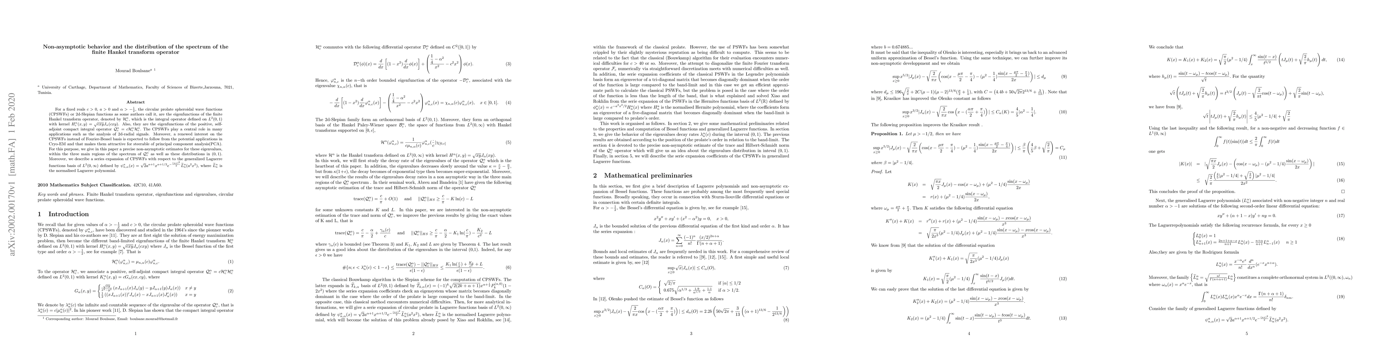 This paper provides non-asymptotic estimates for the eigenvalues of the finite Hankel transform operator, focusing on the distribution of the spectrum in three main regions. It also presents a series expansion of circular prolate spheroidal wave functions using generalized Laguerre functions.