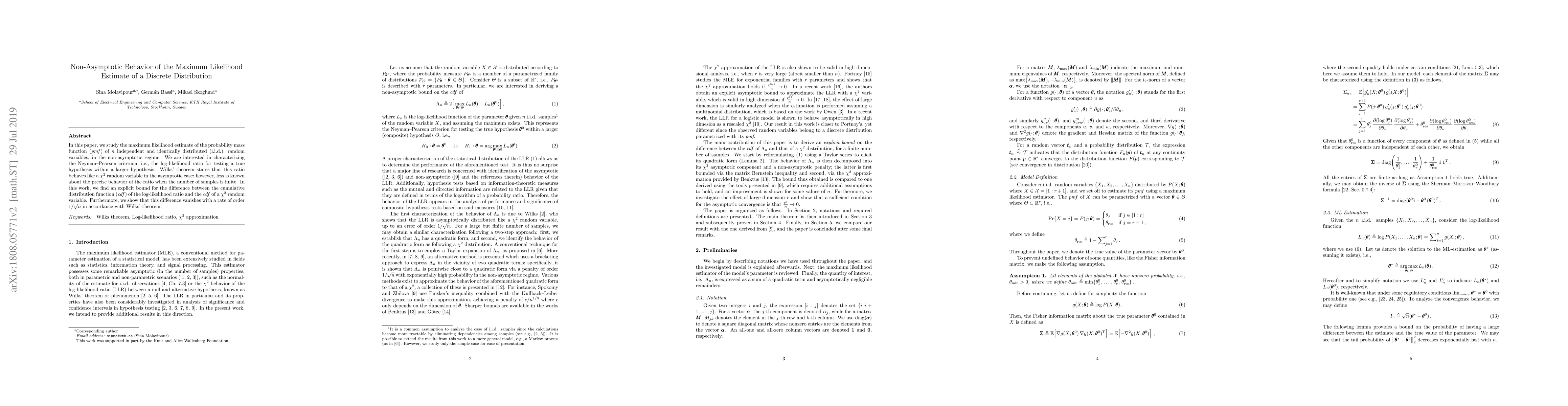 In this paper, we study the maximum likelihood estimate of the probability mass function (pmf) of $n$ independent and identically distributed (i.i.d.) random variables, in the non-asymptotic regime. We are interested in characterizing the Neyman--Pearson criterion, i.e., the log-likelihood ratio for testing a true hypothesis within a larger hypothesis. Wilks' theorem states that this ratio behaves like a $\chi^2$ random variable in the asymptotic case; however, less is known about the precise behavior of the ratio when the number of samples is finite. In this work, we find an explicit bound for the difference between the cumulative distribution function (cdf) of the log-likelihood ratio and the cdf of a $\chi^2$ random variable. Furthermore, we show that this difference vanishes with a rate of order $1/\sqrt{n}$ in accordance with Wilks' theorem.