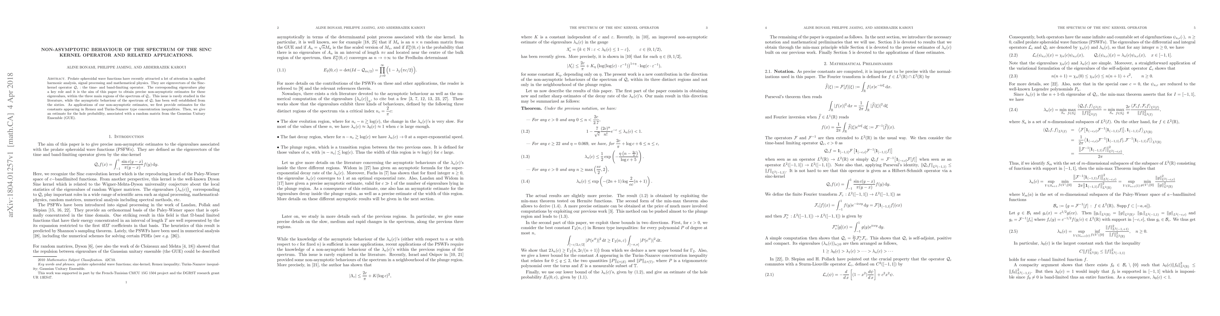 Prolate spheroidal wave functions have recently attracted a lot of attention in applied harmonic analysis, signal processing and mathematical physics. They are eigenvectors of the Sinc-kernel operator Qc : the time-and band-limiting operator. The corresponding eigenvalues play a key role and it is the aim of this paper to obtain precise non-asymptotic estimates for these eigenvalues, within the three main regions of the spectrum of Qc. This issue is rarely studied in the literature, while the asymptotic behaviour of the spectrum of Qc has been well established from the sixties. As applications of our non-asymptotic estimates, we first provide estimates for the constants appearing in Remez and Tur{\`a}n-Nazarov type concentration inequalities. Then, we give an estimate for the hole probability, associated with a random matrix from the Gaussian Unitary Ensemble (GUE).