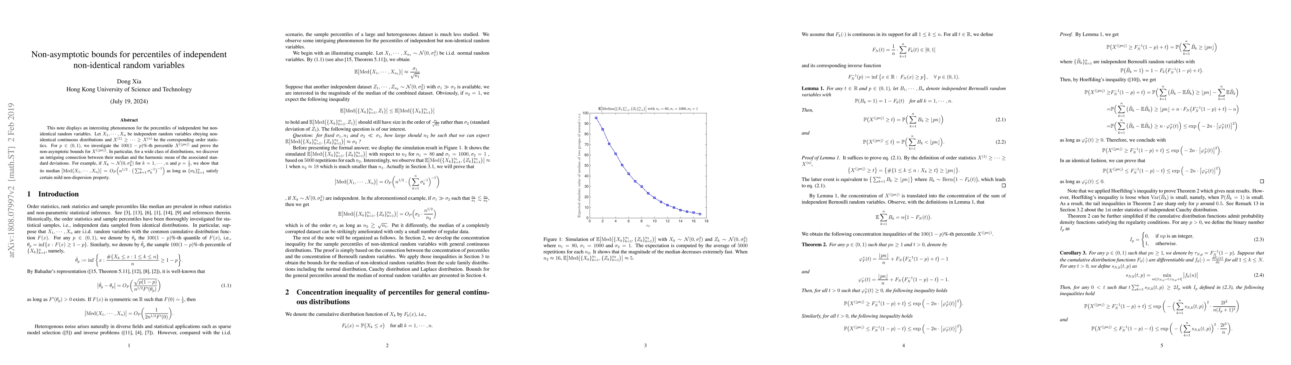 This paper investigates non-asymptotic bounds for the $100(1-p)$%-th percentile of independent but non-identical random variables, revealing a connection between the median and the harmonic mean of their standard deviations for a broad class of distributions. Specifically, for normally distributed variables, the median is shown to scale with a term involving the inverse of the harmonic mean of the standard deviations under certain conditions.