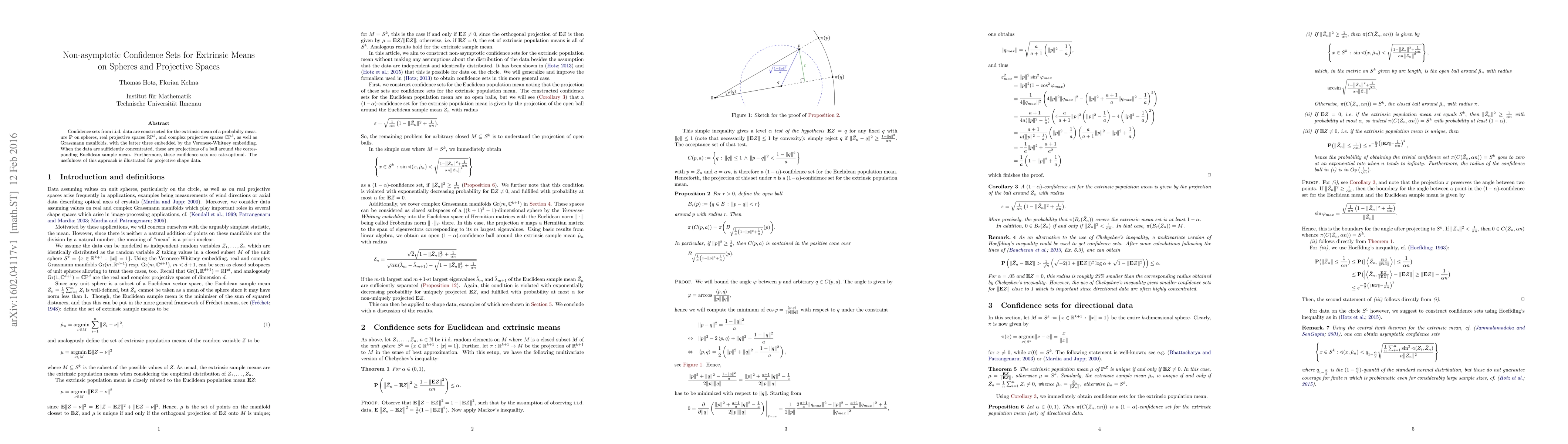 This paper constructs rate-optimal confidence sets for the extrinsic mean of probability measures on spheres, real projective spaces, complex projective spaces, and Grassmann manifolds. The method ensures the sets approximate a ball around the Euclidean sample mean when data is concentrated, demonstrating utility with projective shape data.