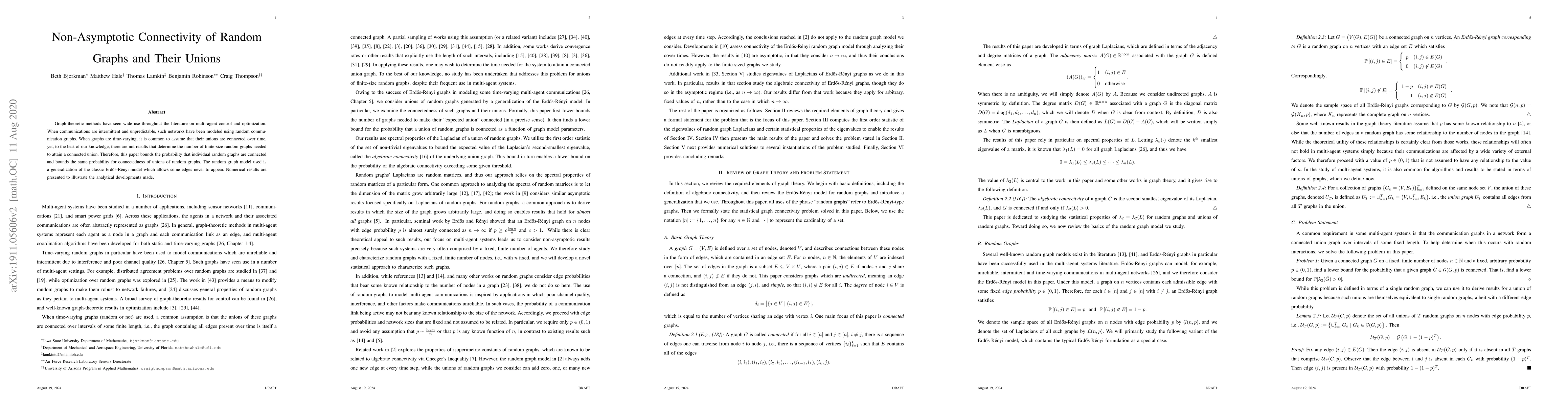 Graph-theoretic methods have seen wide use throughout the literature on multi-agent control and optimization. When communications are intermittent and unpredictable, such networks have been modeled using random communication graphs. When graphs are time-varying, it is common to assume that their unions are connected over time, yet, to the best of our knowledge, there are not results that determine the number of finite-size random graphs needed to attain a connected union. Therefore, this paper bounds the probability that individual random graphs are connected and bounds the same probability for connectedness of unions of random graphs. The random graph model used is a generalization of the classic Erdos-Renyi model which allows some edges never to appear. Numerical results are presented to illustrate the analytical developments made.