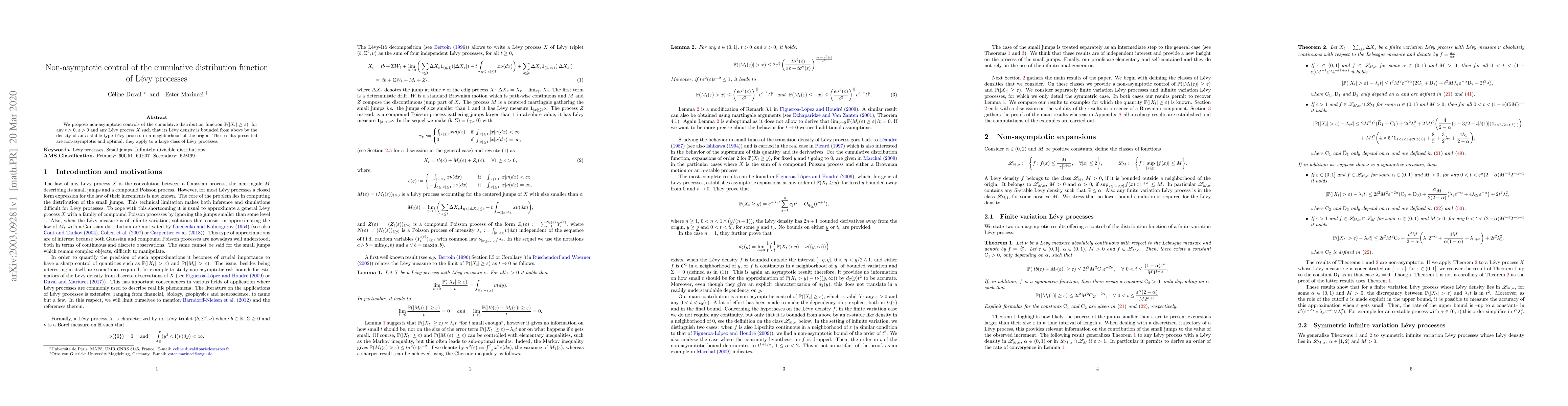 We propose non-asymptotic controls of the cumulative distribution function $P(|X_{t}|\ge \varepsilon)$, for any $t>0$, $\varepsilon>0$ and any L\'evy process $X$ such that its L\'evy density is bounded from above by the density of an $\alpha$-stable type L\'evy process in a neighborhood of the origin. The results presented are non-asymptotic and optimal, they apply to a large class of L\'evy processes.