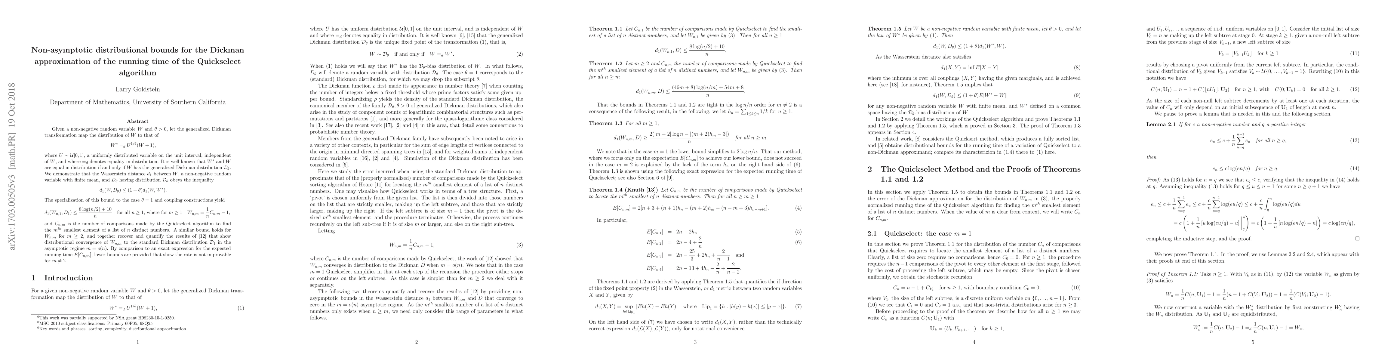 Given a non-negative random variable $W$ and $\theta>0$, let the generalized Dickman transformation map the distribution of $W$ to that of $$ W^*=_d U^{1/\theta}(W+1), $$ where $U \sim {\cal U}[0,1]$, a uniformly distributed variable on the unit interval, independent of $W$, and where $=_d$ denotes equality in distribution. It is well known that $W^*$ and $W$ are equal in distribution if and only if $W$ has the generalized Dickman distribution ${\cal D}_\theta$. We demonstrate that the Wasserstein distance $d_1$ between $W$, a non-negative random variable with finite mean, and $D_\theta$ having distribution ${\cal D}_\theta$ obeys the inequality $$ d_1(W,D_\theta) \le (1+\theta)d_1(W,W^*). $$ The specialization of this bound to the case $\theta=1$ and coupling constructions yield $$ d_1(W_{n,1},D) \le \frac{8\log (n/2)+10}{n} \quad \mbox{for all $n \ge 1$, where} \quad W_{n,1}=\frac{1}{n}C_{n,1}-1, $$ and $C_{n,m}$ is the number of comparisons made by the Quickselect algorithm to find the $m^{th}$ smallest element of a list of $n$ distinct numbers. A similar bound holds for $m \ge 2$, and together recover the results of [12] that show distributional convergence of $W_n$ to the standard Dickman distribution in the asymptotic regime $m=o(n)$. By developing an exact expression for the expected running time $E[C_{n,m}]$, lower bounds are provided that show the rate is not improvable for all $m \not = 2$.
