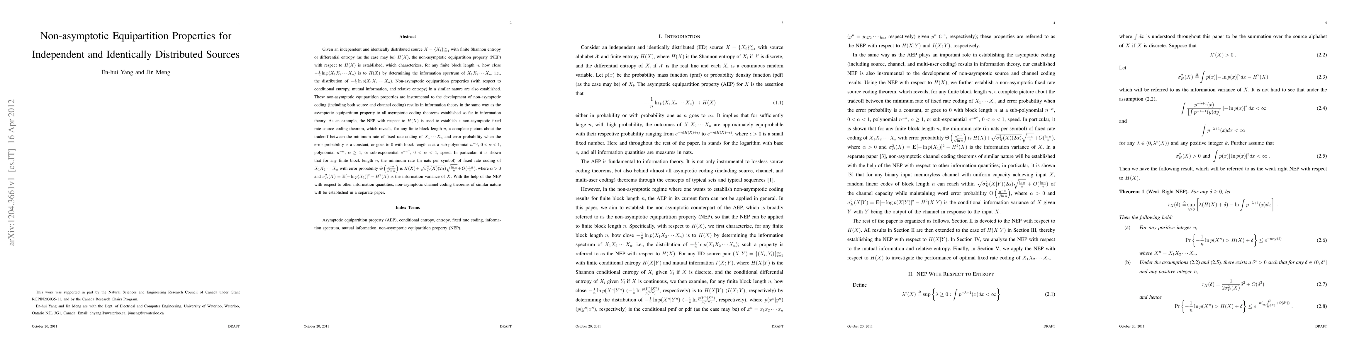 Given an independent and identically distributed source $X = \{X_i \}_{i=1}^{\infty}$ with finite Shannon entropy or differential entropy (as the case may be) $H(X)$, the non-asymptotic equipartition property (NEP) with respect to $H(X)$ is established, which characterizes, for any finite block length $n$, how close $-{1\over n} \ln p(X_1 X_2...X_n)$ is to $H(X)$ by determining the information spectrum of $X_1 X_2...X_n $, i.e., the distribution of $-{1\over n} \ln p(X_1 X_2...X_n)$. Non-asymptotic equipartition properties (with respect to conditional entropy, mutual information, and relative entropy) in a similar nature are also established. These non-asymptotic equipartition properties are instrumental to the development of non-asymptotic coding (including both source and channel coding) results in information theory in the same way as the asymptotic equipartition property to all asymptotic coding theorems established so far in information theory. As an example, the NEP with respect to $H(X)$ is used to establish a non-asymptotic fixed rate source coding theorem, which reveals, for any finite block length $n$, a complete picture about the tradeoff between the minimum rate of fixed rate coding of $X_1...X_n$ and error probability when the error probability is a constant, or goes to 0 with block length $n$ at a sub-polynomial, polynomial or sub-exponential speed. With the help of the NEP with respect to other information quantities, non-asymptotic channel coding theorems of similar nature will be established in a separate paper.