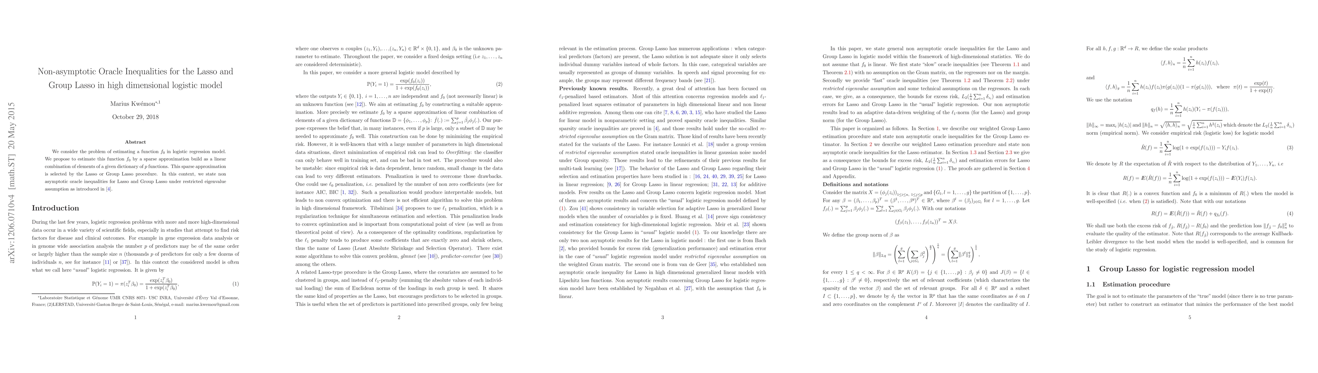 Summary: This paper proposes sparse approximations for estimating functions in high-dimensional logistic regression using Lasso or Group Lasso methods. It establishes non-asymptotic oracle inequalities under the restricted eigenvalues assumption, providing insights into the performance of these estimation techniques.