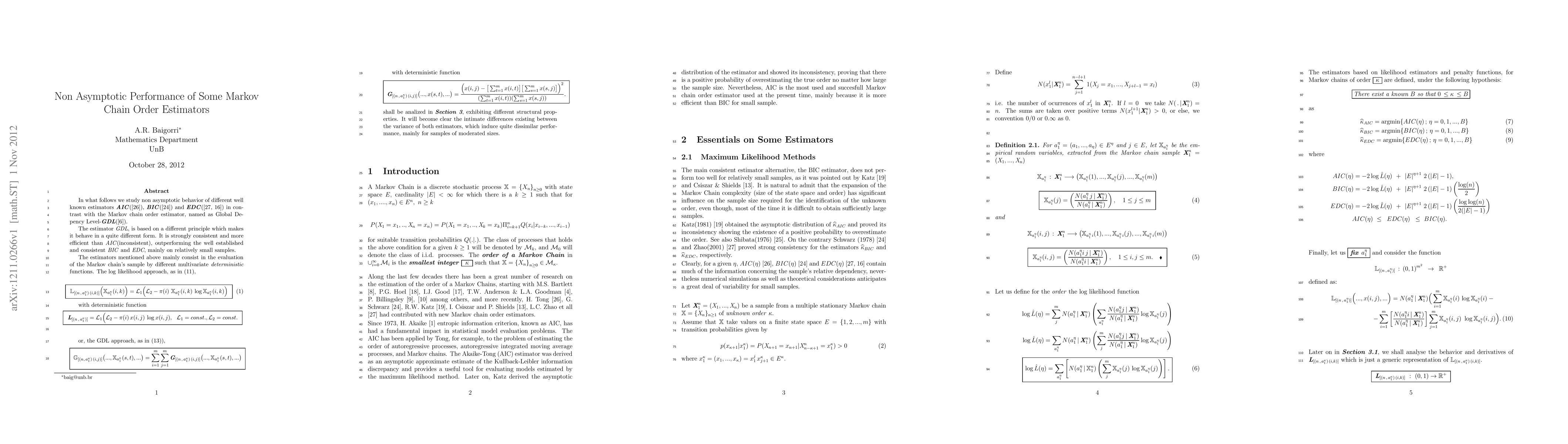 In what follows we study non asymptotic behavior of different well known estimators AIC(\cite{Tong}), BIC(\cite{Schwarz}) and EDC(\cite{Zhao,Dorea}) in contrast with the Markov chain order estimator, named as Global Depency Level - GDL(\cite{Baigorri}). The estimator GDL, is based on a different principle which makes it behave in a quite different form. It is strongly consistent and more efficient than AIC(inconsistent), outperforming the well established and consistent BIC and EDC, mainly on relatively small samples. The estimators mentioned above mainly consist in the evaluation of the Markov chain's sample by different multivariate deterministic functions. The log likelihood approach or the GDL approach, shall be analysed exhibiting different structural properties. It will become clear the intimate differences existing between the variance of both estimators, which induce quite dissimilar performance, mainly for samples of moderated sizes.