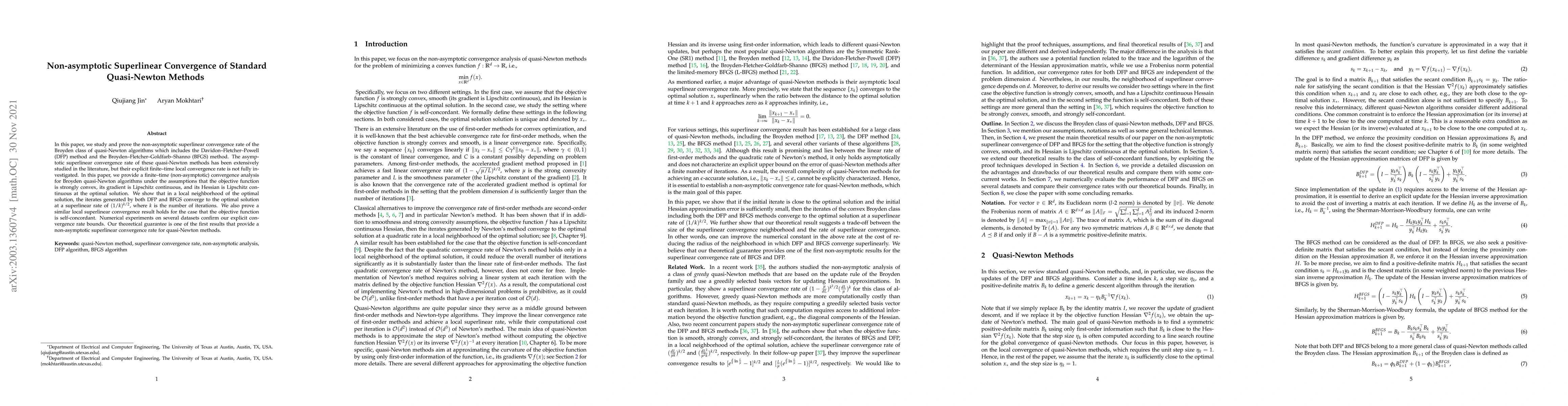 This paper proves that quasi-Newton algorithms converge to the optimal solution at a superlinear rate of $(1/k)^{k/2}$, where $k$ is the number of iterations, under certain assumptions about the objective function and its derivatives.