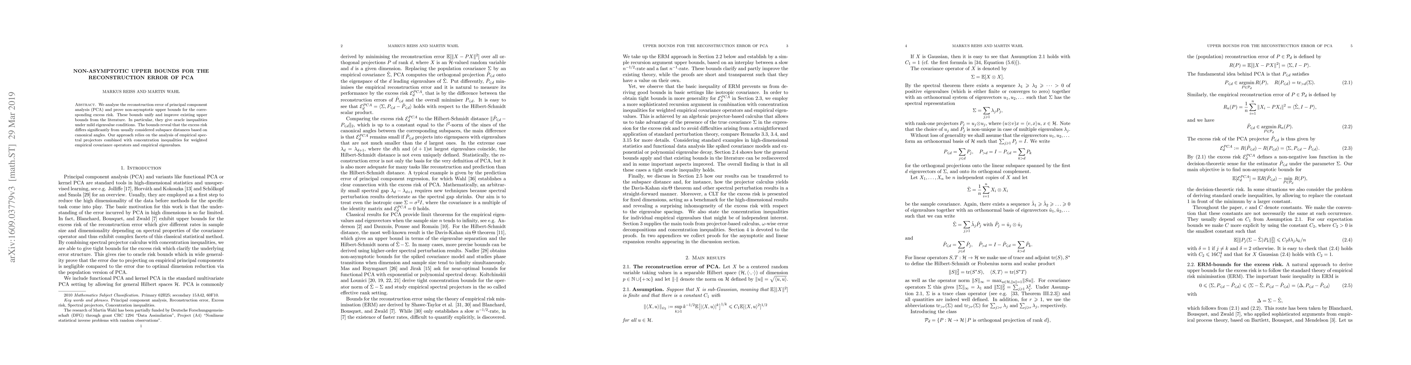 This paper provides non-asymptotic upper bounds for the reconstruction error of PCA, improving existing literature and revealing that the excess risk is distinct from typical subspace distances. The approach uses empirical spectral projectors and concentration inequalities for covariance operators.