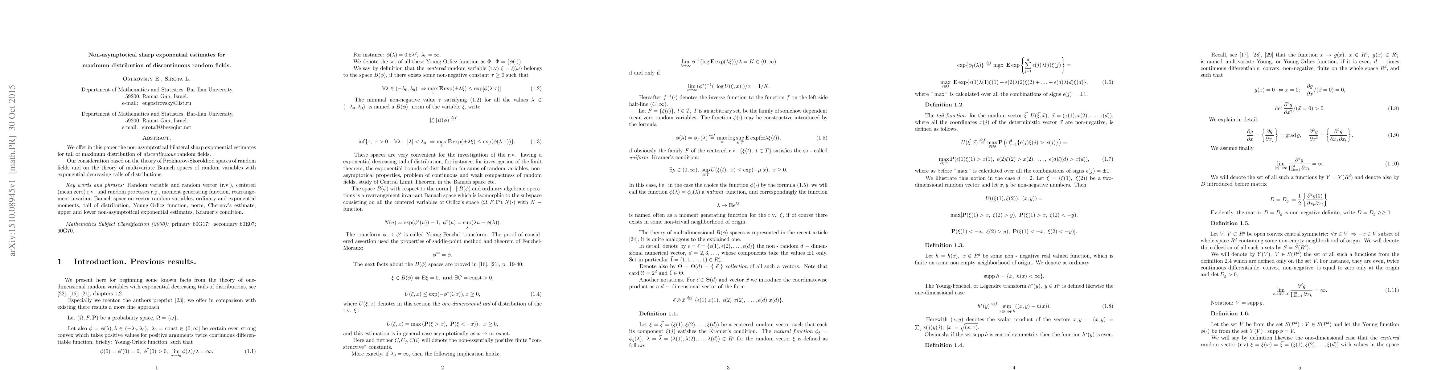 We offer in this paper the non-asymptotical bilateral sharp exponential estimates for tail of maximum distribution of {\it discontinuous} random fields. Our consideration based on the theory of Prokhorov-Skorokhod spaces of random fields and on the theory of multivariate Banach spaces of random variables with exponential decreasing tails of distributions.