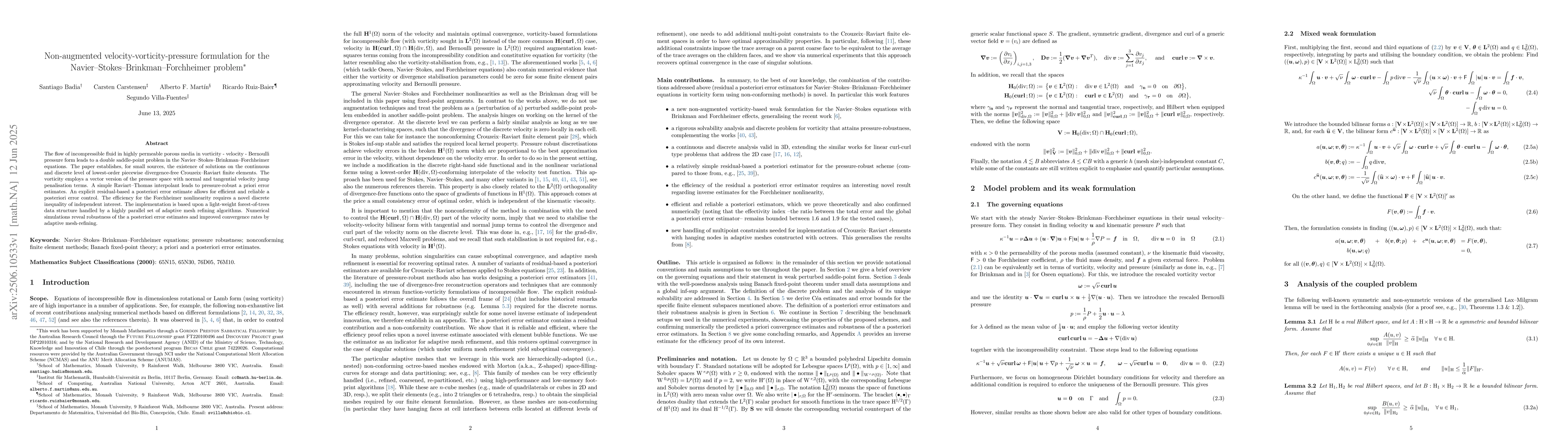 The flow of incompressible fluid in highly permeable porous media in vorticity - velocity - Bernoulli pressure form leads to a double saddle-point problem in the Navier--Stokes--Brinkman--Forchheimer equations. The paper establishes, for small sources, the existence of solutions on the continuous and discrete level of lowest-order piecewise divergence-free Crouzeix--Raviart finite elements. The vorticity employs a vector version of the pressure space with normal and tangential velocity jump penalisation terms. A simple Raviart--Thomas interpolant leads to pressure-robust a priori error estimates. An explicit residual-based a posteriori error estimate allows for efficient and reliable a posteriori error control. The efficiency for the Forchheimer nonlinearity requires a novel discrete inequality of independent interest. The implementation is based upon a light-weight forest-of-trees data structure handled by a highly parallel set of adaptive {mesh refining} algorithms. Numerical simulations reveal robustness of the a posteriori error estimates and improved convergence rates by adaptive mesh-refining.