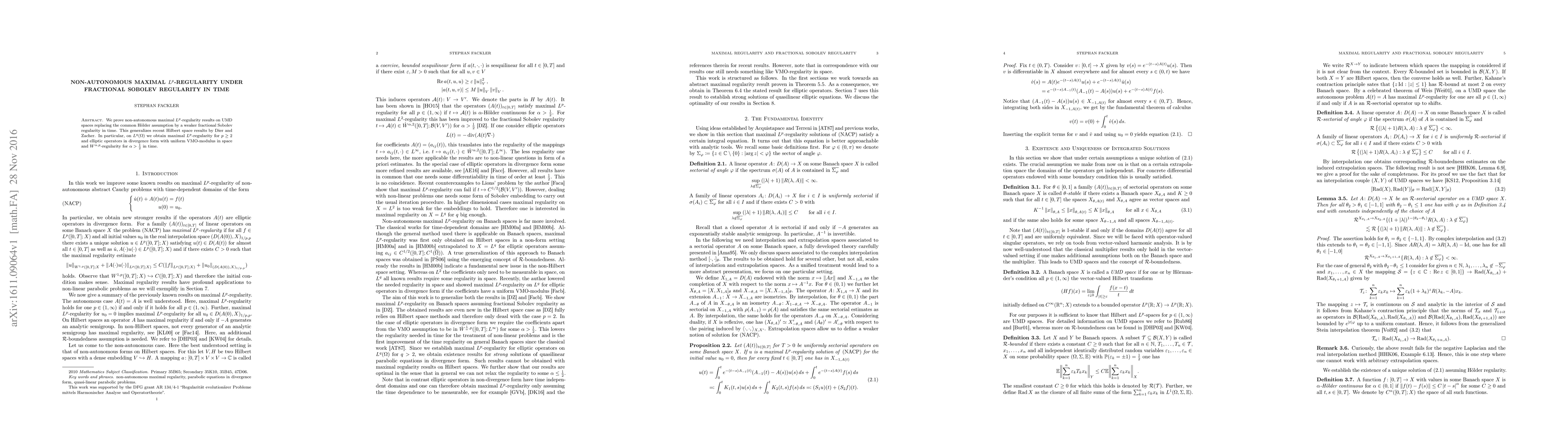 Summary: The paper establishes non-autonomous maximal $L^p$-regularity results for elliptic operators in divergence form, replacing the conventional H\"older assumption with fractional Sobolev regularity in time. This advancement generalizes earlier Hilbert space findings and applies to $L^q(\Omega)$ spaces with specific modulus conditions.