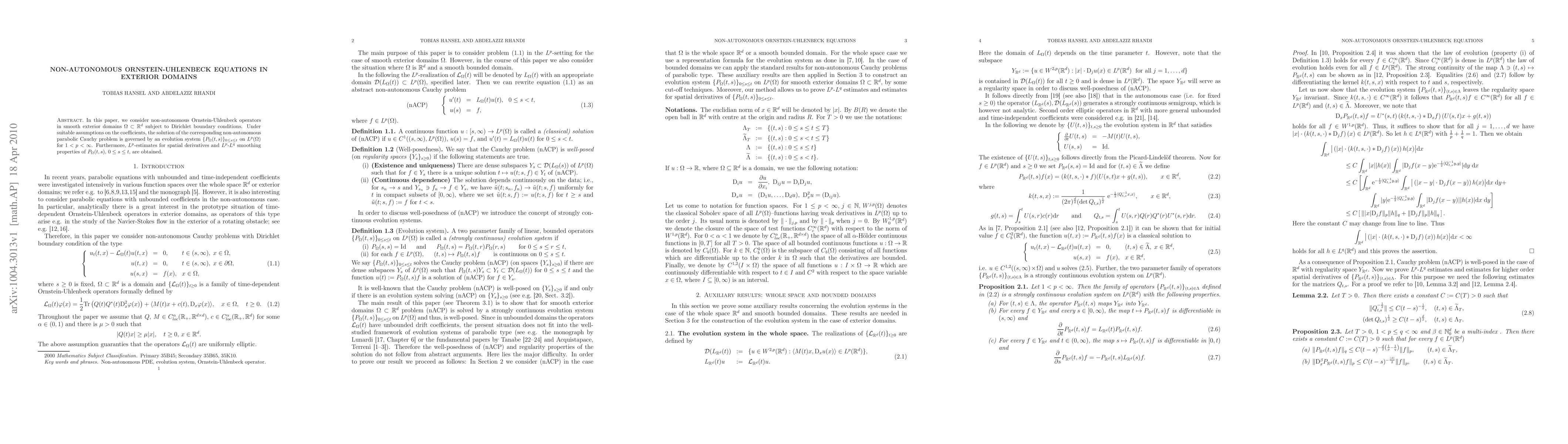 This paper investigates non-autonomous Ornstein-Uhlenbeck operators in smooth exterior domains under Dirichlet conditions, establishing an evolution system for the solution and deriving $L^p$-estimates for spatial derivatives and $L^p$-$L^q$ smoothing properties.