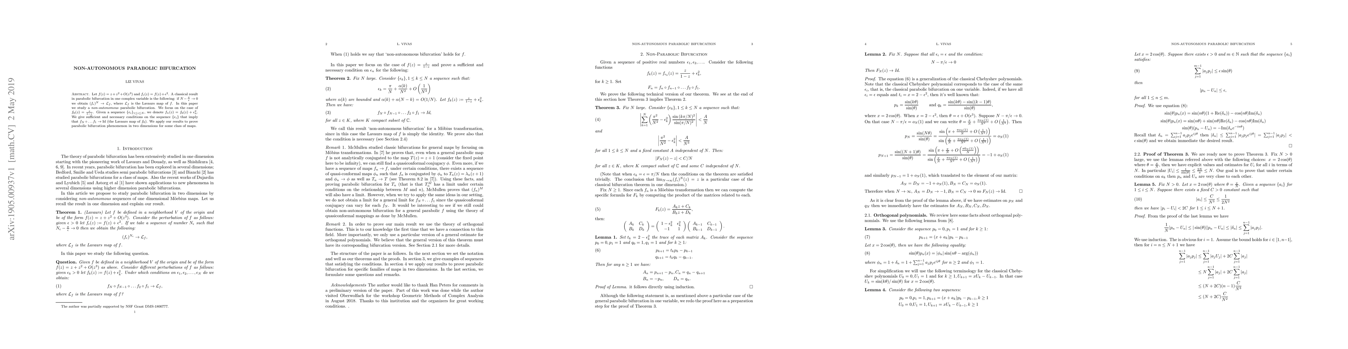 This paper investigates non-autonomous parabolic bifurcation in complex dynamics, focusing on the function $f_0(z)=\frac{z}{1-z}$. It provides conditions on a sequence $\{\epsilon_i\}$ ensuring that the composition of modified functions $f_n(z)$ converges to the identity, and applies these results to demonstrate bifurcation phenomena in two-dimensional maps.
