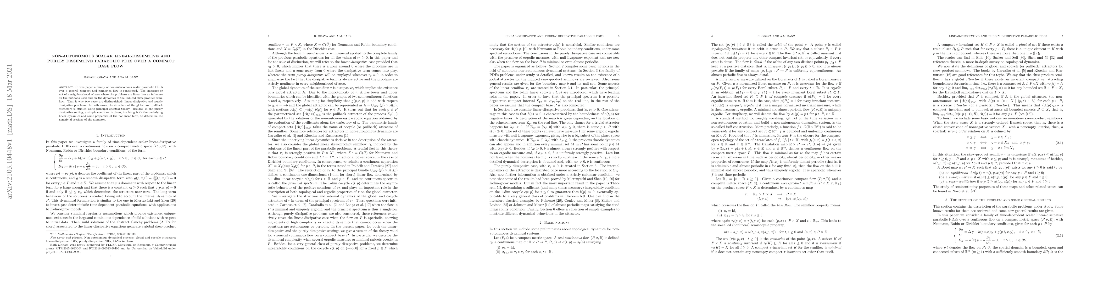 In this paper a family of non-autonomous scalar parabolic PDEs over a general compact and connected flow is considered. The existence or not of a neighbourhood of zero where the problems are linear has an influence on the methods used and on the dynamics of the induced skew-product semiflow. That is why two cases are distinguished: linear-dissipative and purely dissipative problems. In both cases, the structure of the global and pullback attractors is studied using principal spectral theory. Besides, in the purely dissipative setting, a simple condition is given, involving both the underlying linear dynamics and some properties of the nonlinear term, to determine the nontrivial sections of the attractor.