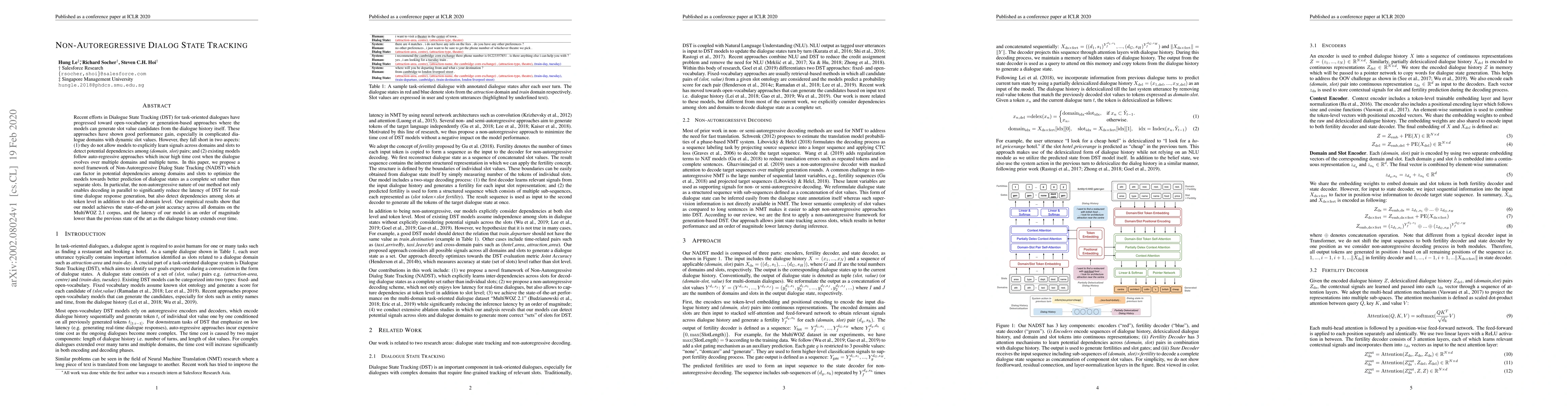 Recent efforts in Dialogue State Tracking (DST) for task-oriented dialogues have progressed toward open-vocabulary or generation-based approaches where the models can generate slot value candidates from the dialogue history itself. These approaches have shown good performance gain, especially in complicated dialogue domains with dynamic slot values. However, they fall short in two aspects: (1) they do not allow models to explicitly learn signals across domains and slots to detect potential dependencies among (domain, slot) pairs; and (2) existing models follow auto-regressive approaches which incur high time cost when the dialogue evolves over multiple domains and multiple turns. In this paper, we propose a novel framework of Non-Autoregressive Dialog State Tracking (NADST) which can factor in potential dependencies among domains and slots to optimize the models towards better prediction of dialogue states as a complete set rather than separate slots. In particular, the non-autoregressive nature of our method not only enables decoding in parallel to significantly reduce the latency of DST for real-time dialogue response generation, but also detect dependencies among slots at token level in addition to slot and domain level. Our empirical results show that our model achieves the state-of-the-art joint accuracy across all domains on the MultiWOZ 2.1 corpus, and the latency of our model is an order of magnitude lower than the previous state of the art as the dialogue history extends over time.