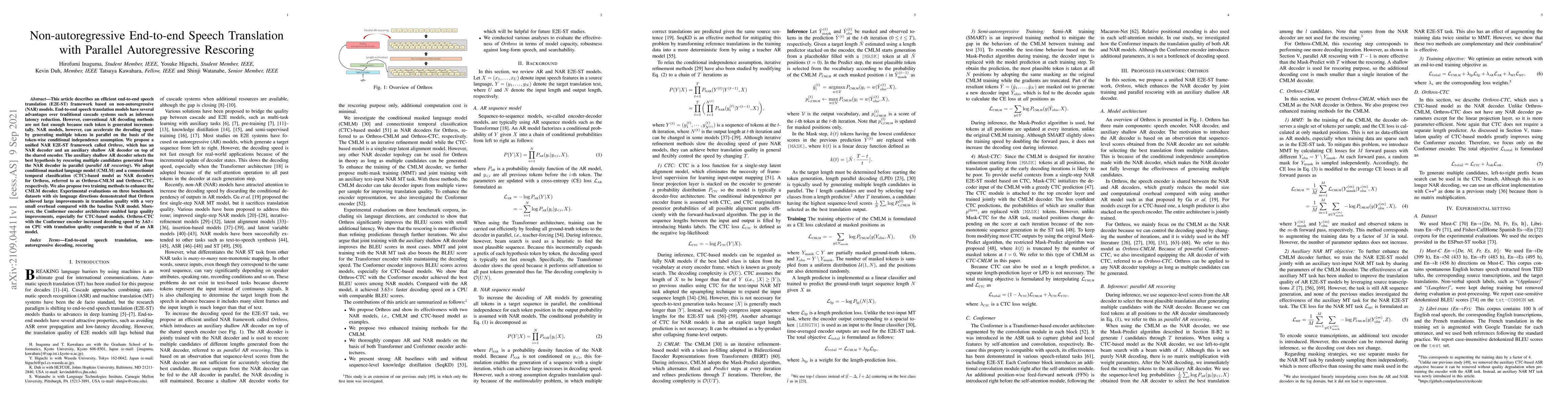 This paper introduces a non-autoregressive end-to-end speech translation framework called Orthros, which combines an NAR decoder with parallel autoregressive rescoring to achieve faster translation speeds while maintaining high translation quality. Orthros-CTC with the Conformer encoder achieved a 3.63x speedup on CPU compared to autoregressive models, with comparable translation quality.