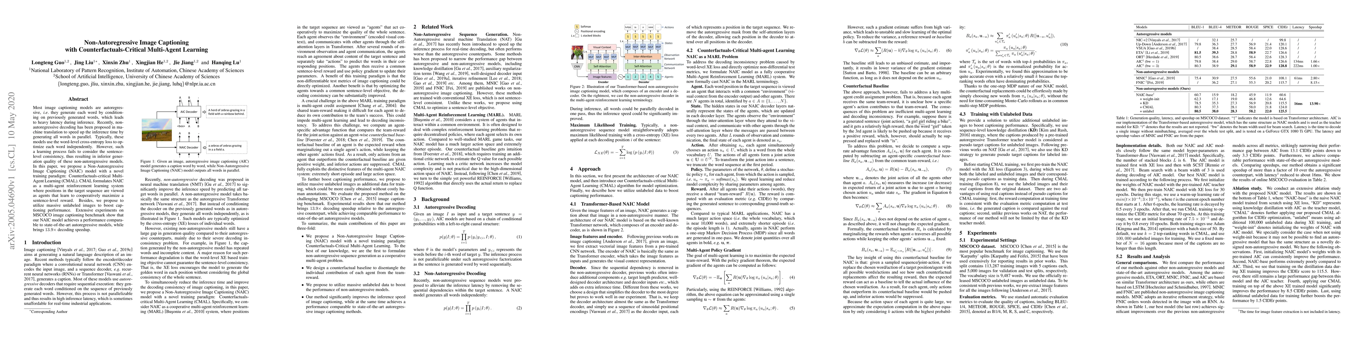 This paper proposes a Non-Autoregressive Image Captioning (NAIC) model using Counterfactuals-critical Multi-Agent Learning (CMAL) to improve captioning quality and speed up inference. The CMAL approach optimizes word generation cooperatively for sentence-level consistency, achieving comparable performance to autoregressive models with a 13.9x speedup.