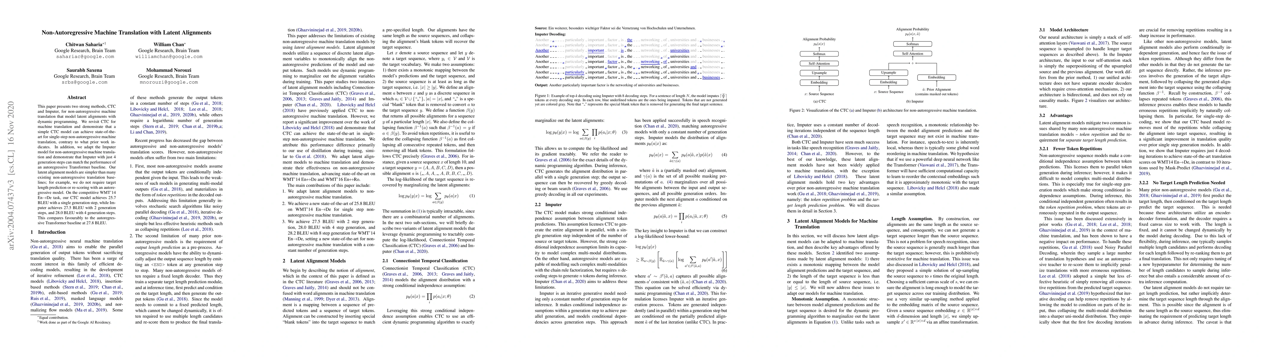 This paper introduces CTC and Imputer methods for non-autoregressive machine translation, showing they achieve state-of-the-art results without requiring target length prediction or re-scoring. CTC achieves 25.7 BLEU in one step, while Imputer reaches 28.0 BLEU in four steps, rivaling the 27.8 BLEU of an autoregressive Transformer baseline.